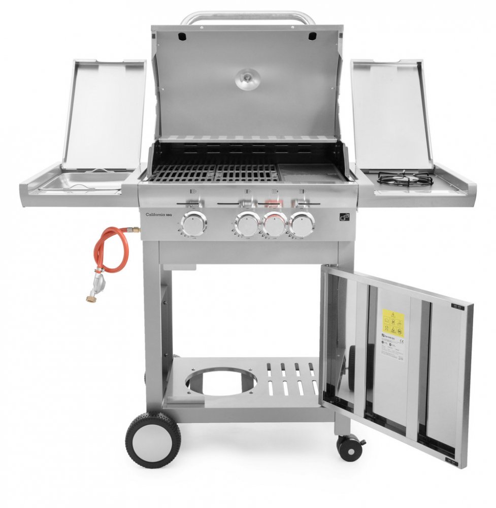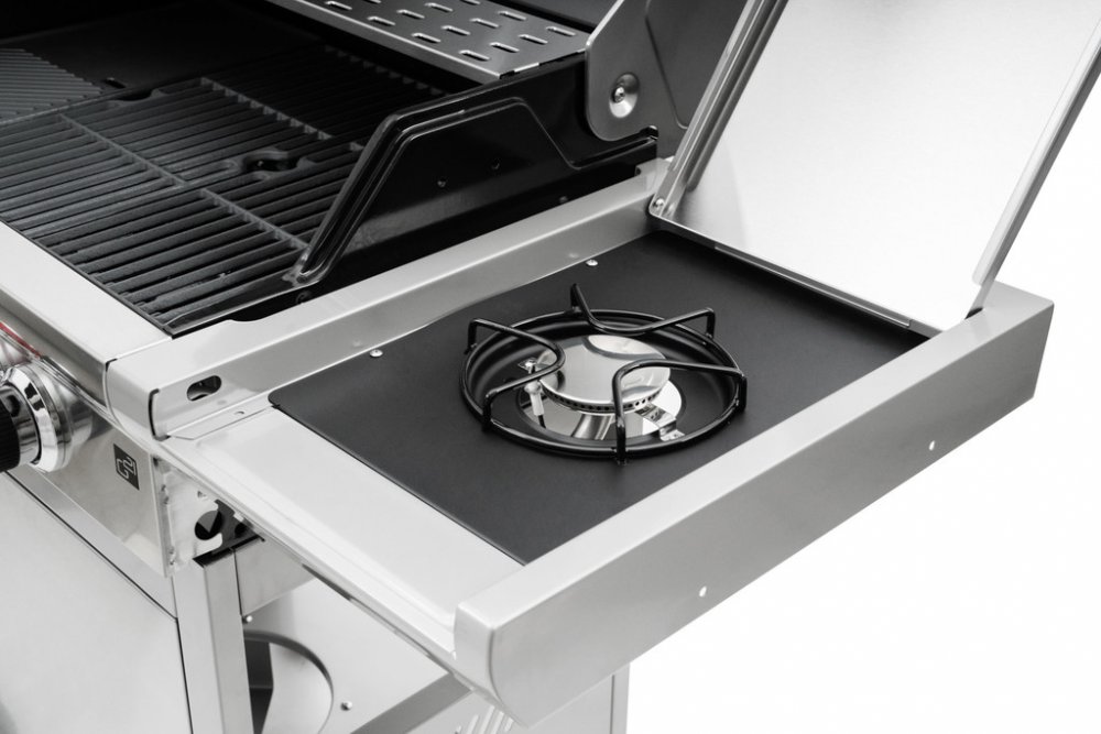 Zahradní plynový gril je opatřen odklápěcím krytem grilovací plochy a odkládacími poličkami na obou stranách. Pod levou odkládací plochou se skrývá nádobka, kam můžete odkládat např. naložené maso připravené ke grilování. Pod pravou odkládací plochou se nachází boční hořák. Gril je vyrobený z kvalitního nerezu.