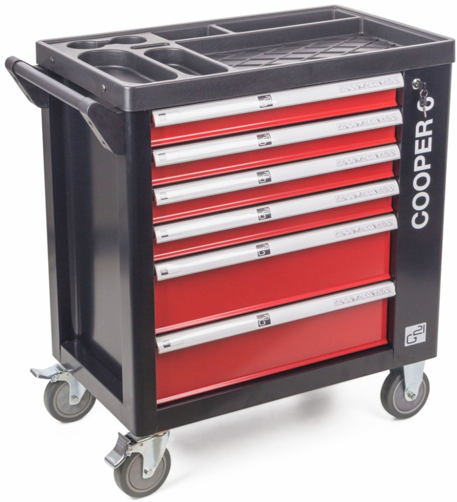 Dílenský vozík G21 Cooper 6 je zkonstruovaný tak, aby pojal co největší množství dílenského nářadí a příslušenství. V 6 vnitřních zásuvkách a boční skříňce najdete místo pro uložení šroubováků, kleští, vrtaček, aku nářadí nebo příslušenství a dalšího nezbytného dílenského vybavení.