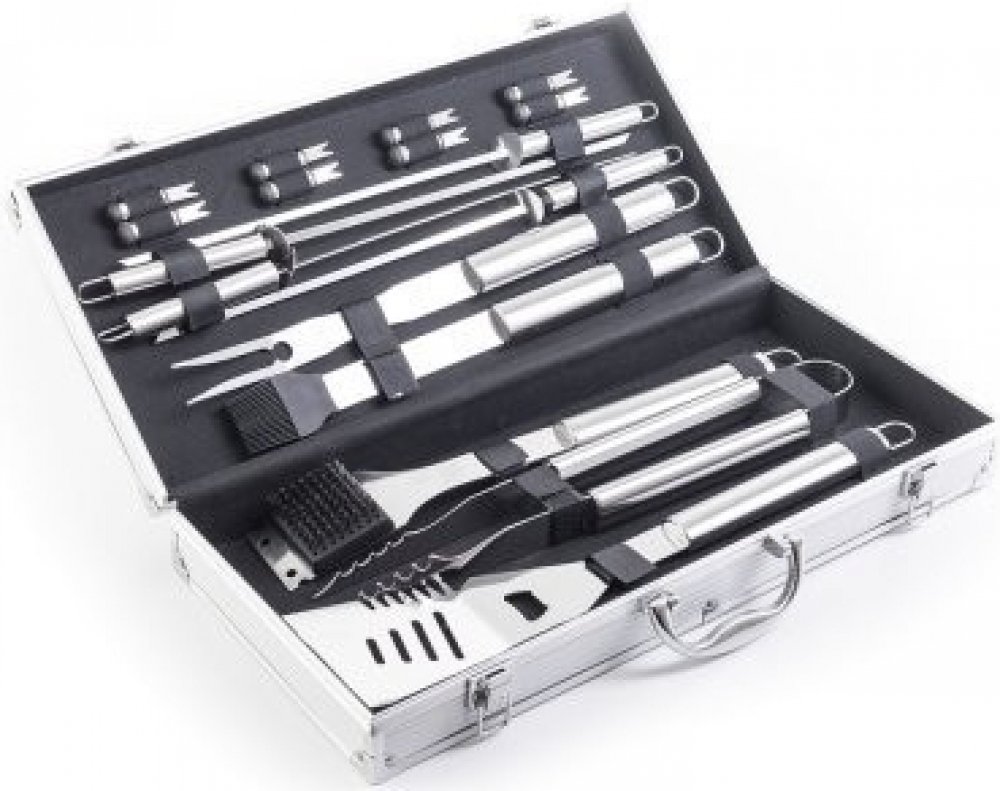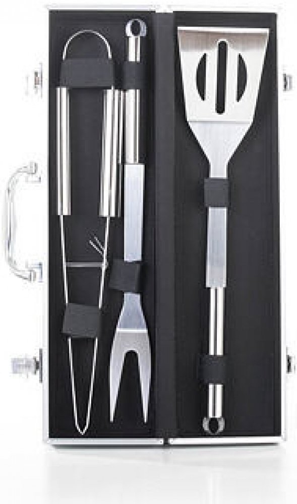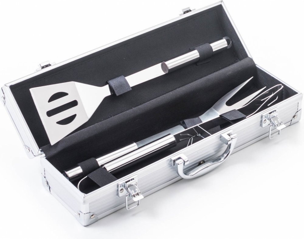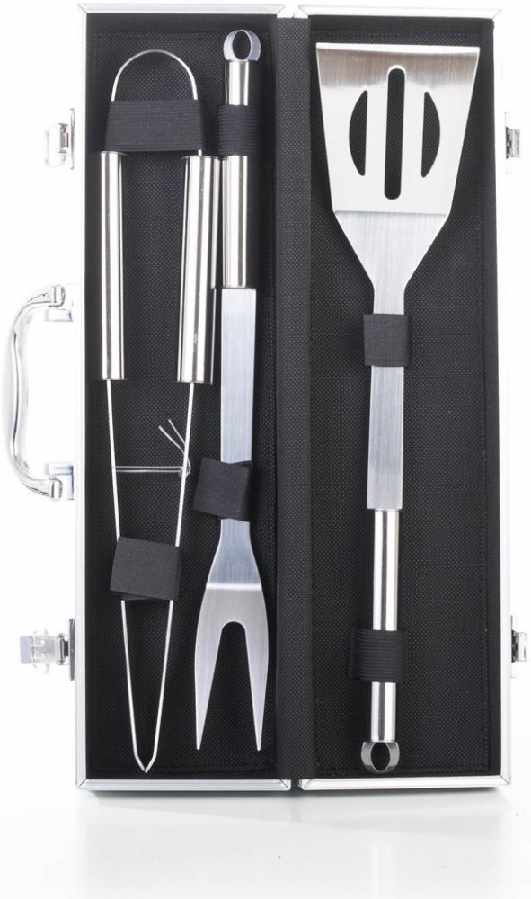 Sada obsahuje kompletní nástroje pro grilování bez potíží. Součástí sady je obracečka, vidlička a kleště o délce 34 cm. Pro snadné přenášení a skladování je nářadí uloženo do praktického hliníkového kufru.