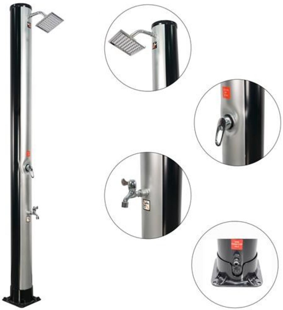 Tělo sprchy v elegantní černo-stříbrné barvě slouží zároveň jako solární kolektor - absorbuje sluneční paprsky a ohřívá vodu bez potřeby elektřiny či plynu. Když si dopřejete sprchu před plaváním, ochráníte vodu v bazénu před zbytečným znečištěním. Tím si výrazně usnadníte jeho údržbu.