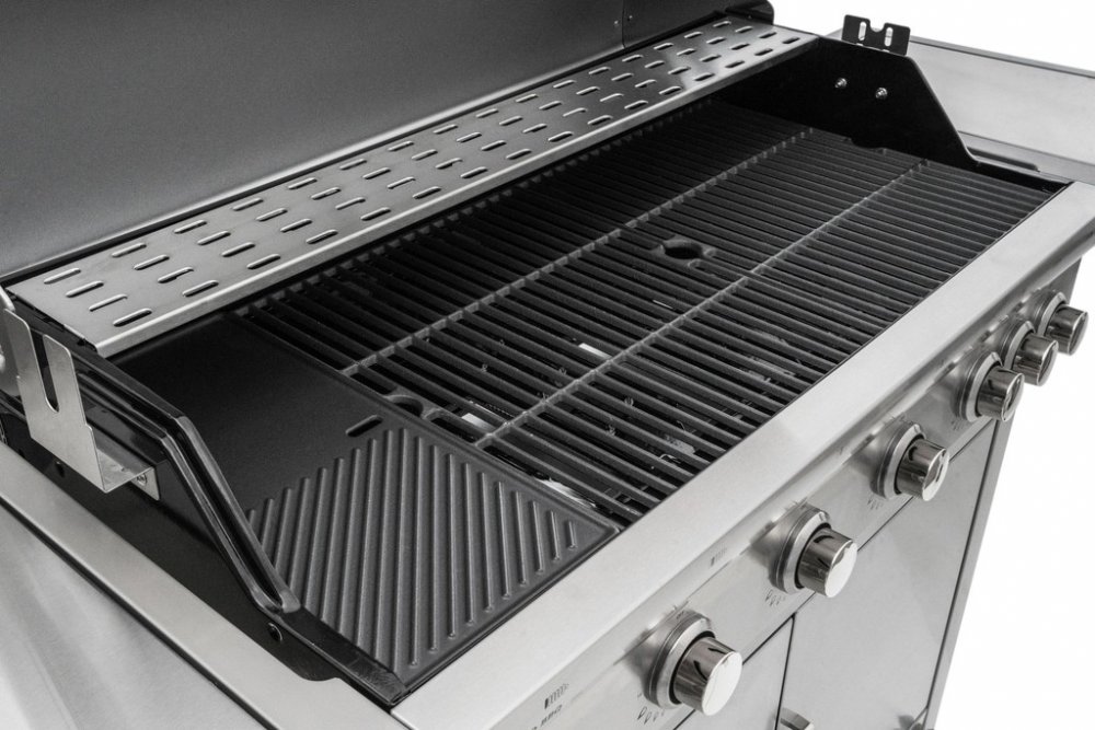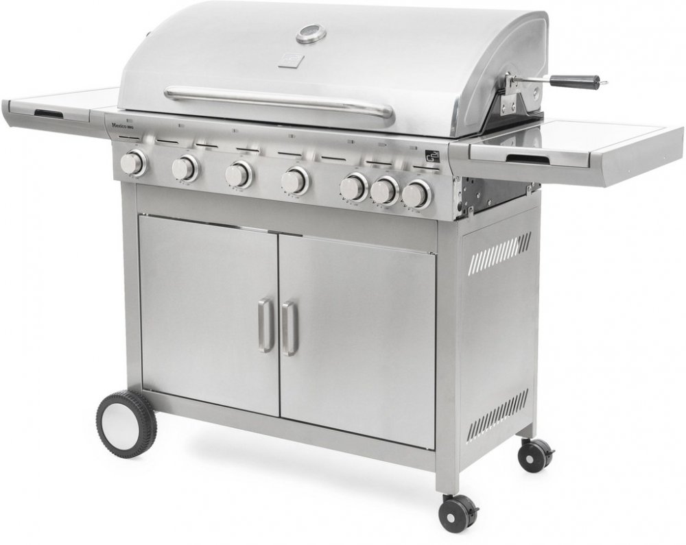 Plynový gril G21 Mexico BBQ Premium Line je vybaven systémem Flame Tamer, 6 hlavními nerezovými hořáky a jedním bočním hořákem s elektrickým zapalováním a plynovou regulací. V dnešní době se grilování a pořádání grilovacích garden party se zahradními grily těší v České republice velké oblibě. Kromě klasického grilování na dřevěném uhlí je velmi rozšířené grilování právě na plynovém grilu. Grilování na plynových grilech je moderním a hlavně praktickým řešením, které neztrácí na kráse grilování. Zahradní plynové grily mají jednoduché použití a pokrmy na nich může připravovat každý. Stačí pouze připojit láhev s plynem a gril je ihned připraven k používání. Každý jistě ocení také to, že po grilování v plynovém grilu nemusíte uklízet popel a další zbytky po dřevěném uhlí. Plynové grily G21 Mexico BBQ Premium Line jsou pojízdné, neboť jsou vybaveny dvěma většími a dvěma menšími kolečky. Gril má vestavěný a zároveň velmi praktický teploměr pro zjištění optimální teploty grilování, který je zabudovaný ve víku grilu. Zahradní nerezový plynový gril je opatřen odklápěcím krytem grilovací plochy a odkládacími poličkami na obou stranách. Pod levou odkládací plochou se skrývá nádobka, kam můžete odkládat např. naložené maso připravené ke grilování. Pod pravou odkládací plochou se nachází boční hořák. Disponuje také litinovou deskou a litinovým roštem. Gril je vyrobený z kvalitního nerezu. Systém Flame Tamer: Přímo nad hořáky je umístěn kovový profil, který zabraňuje skapávání tuku mezi plameny a jeho vzplanutí. Zároveň zabraňuje přímému ohřevu mřížky pouze v místě hořáku, nedochází tak k přehřívání pouze jedné části mřížky, ale celá mřížka se vyhřívá rovnoměrně. Případný tuk skapávající z grilovaného masa stéká po stěnách grilu do odkapávací misky ve spodní části grilu, což prodlužuje životnost hořáků. Grilovací jehla: K zahradnímu grilu od nás zdarma obdržíte redukční ventil a nerezovou grilovací jehlu s motorem. Grilovací jehla s motorem je vyrobena z nerezové oceli a z obou stran je opatřena čtyřmi jehlicemi s aretačními šrouby, díky kterým si můžete jehlice nastavit podle vlastní potřeby. Z jedné strany je jehla opatřena odnímatelným plastovým držadlem, na kterém je praktické očko pro uchycení. Z druhé strany se nachází motorek v plastovém krytu, na kterém je umístěno tlačítko na zapínání /vypínání. Motorek s napětím 230 V jednoduše zapojíte do elektřiny pomocí kabelu délky cca 125 cm. Motorek s jehlou otáčí rychlostí přibližně 2 otáčky za minutu, aby se připravovaný pokrm nepřipékal, ale pekl se rovnoměrně.Technické údaje: rozměry grilu: 165 x 115 x 55 cm (š x v x h)grilovací prostor: 94,5 x 44 cmhmotnost: 60 kghlavní hořák: 6 xboční hořák: 1 xvýkon: 22,05 kW/hodmateriál: nereztyp grilu: Plynovépiezoelektrické zapalování: Anoodklápěcí kryt: Anoteploměr: Anopojízdný: AnoObsah balení: 1 x zahradní plynový gril1 x redukční ventil s hadicí1 x jehla1 x litinový plát2 x litinový roštrozměr balení: 105 x 62 x 63 cmhmotnost balení: 64 kg