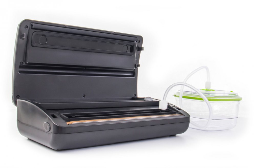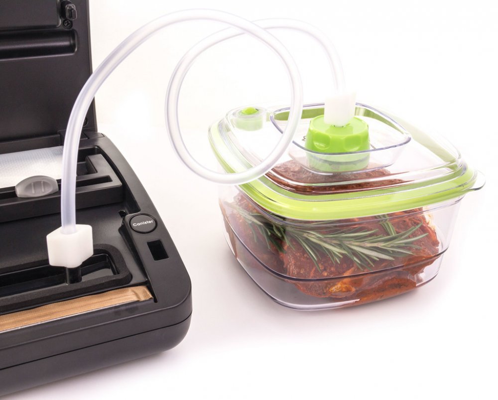 Vakuovačka G21 Nefrit odsává vzduch nejen z vakuovacích sáčků nebo fólií v rolkách, ale i z vakuovacích marinovacích dóz. Stačí napojit hadičku na příslušný otvor vakuovací dózy G21 (hadička je součástí balení dózy) o objemu 1,4 nebo 2 l, zmáčknout příslušné ovládací tlačítko a potraviny v dóze budou spolehlivě zavakuované.