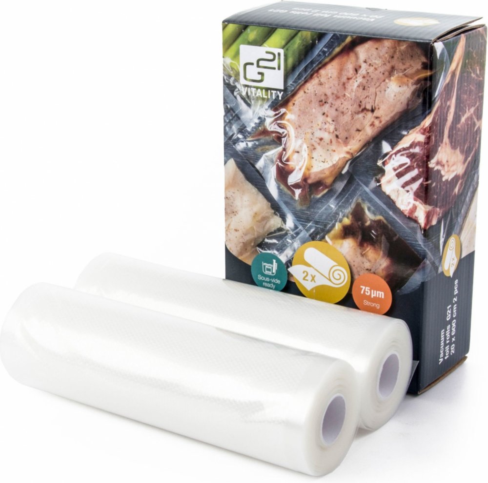 Pevná potravinářská fólie G21 v 6metrové roli o šířce 20 cm je díky své vysoké pevnosti a kvalitnímu provedení vhodná nejen pro prodloužení trvanlivosti potravin vakuováním a jejich uchovávání v ledničce nebo v mrazáku, ale využijete ji i k vakuování surovin pro sous-vide vaření.