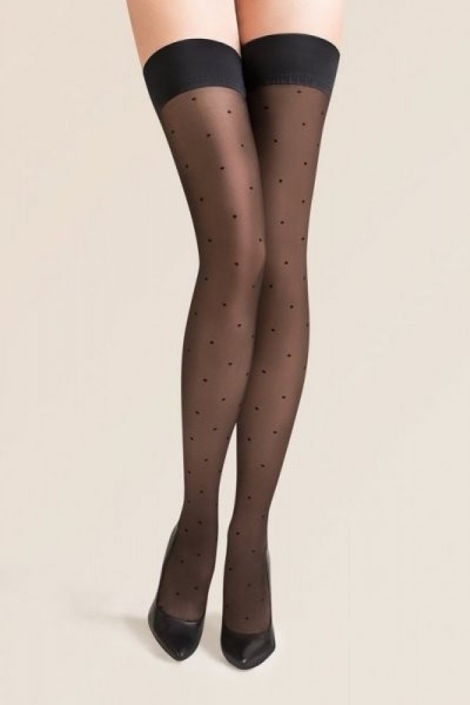 Jemné dámské samodržící punčochy s jemností 20 DEN. Punčochy jsou ozdobené puntíkovaným vzorem. V horní části modelu je hladký materiál, který je na vnitřní straně podšitý širokým silikonovým páskem. Zesílené špičky nejsou viditelné.Složení: 85 % polyamid, 15 % elastan....