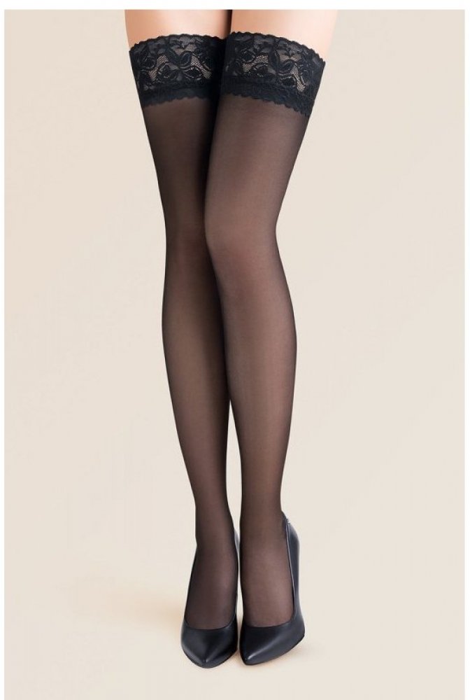 Dámské samodržící punčochy z příze typu lycra zakončené v horní části jemnou krajkou se dvěma silikovými pásky. Pásky na vnitřní straně punčochy zaručující správné držení na noze.