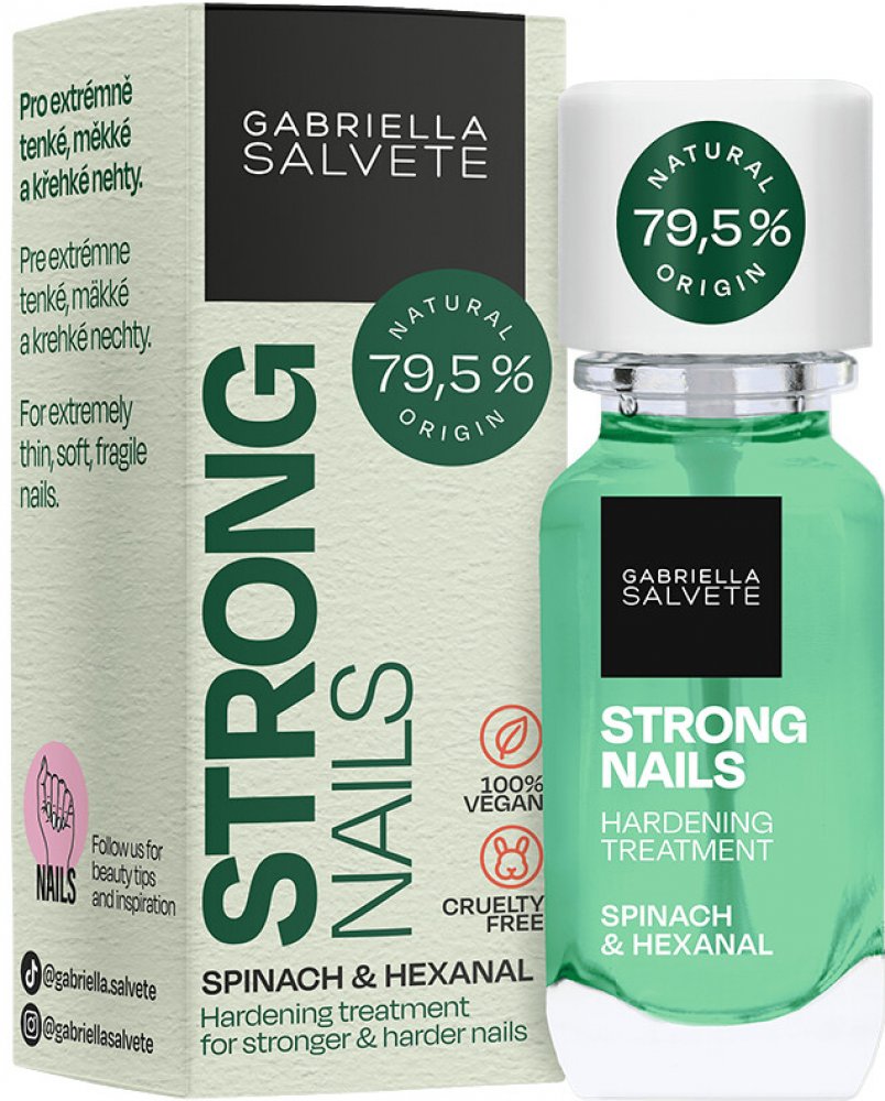 Gabriella Salvete Natural Strong, 11 ml, Péče o nehty pro ženy, Pouze na dobře vyživených a zdravých nehtech může vaše manikúra skutečně vyniknout. Udržet nehty v kondici vám pomůže přípravek Gabriella Salvete Natural Strong, který se postará o profesionální péči. Křehké či oslabené nehty se sklonem třepit se posílí, matným a poškozeným nehtům dodá zdravý lesk. Díky svému speciálnímu složení obohacenému o pečující látky zajistí, že zůstanou pevné, pružné a budou moci růst do délky i do krásy. Ocení ho všichni, kdo chtějí navrátit svým nehtům přirozenou krásu a zdravý vzhled. Vlastnosti: posiluje nehty chrání proti praskání, lámání a třepení nehtů zlepšuje odolnost nehtů vůči mechanickému poškození Složení: veganský produkt Jak používat: Nanášejte na odlakované a dokonale čisté nehty. Nechte zaschnout a poté naneste barevný lak. Lak aplikujte jako poslední krok při manikúře. Používejte podle potřeby.