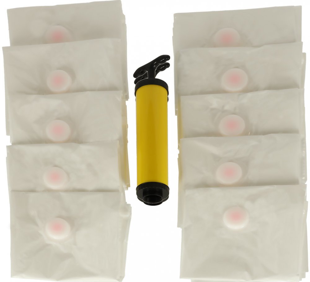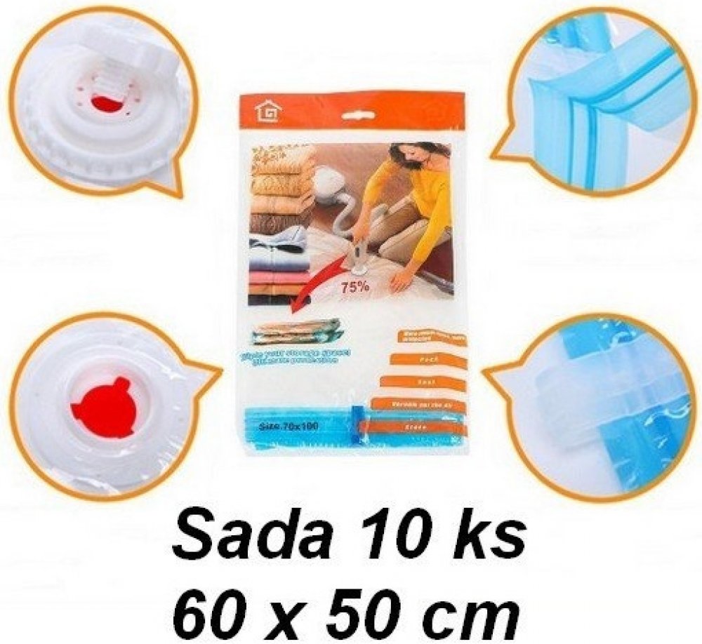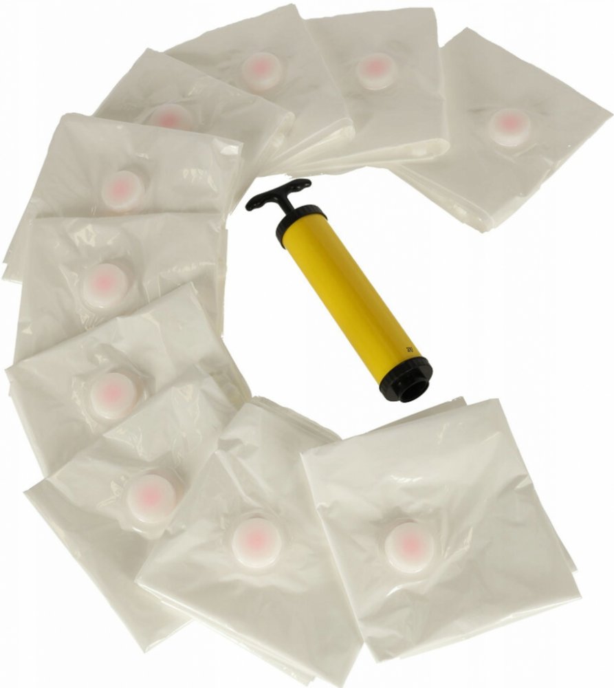 Sada deseti vakuových pytlů je ideální pro skladování sezónního oblečení nebo jiných textilních výrobků. Předměty uložené v sáčku jsou chráněny před prachem a vlhkostí. Součástí balení je pumpička. Rozměry sáčku: Rozměry: 50 cm x 70 cm.