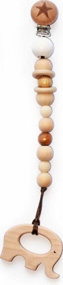 Kousátko, klip, řetízek na dudlík z dřevěných korálků,s kovovým klipem a očkem ze šňůrky.