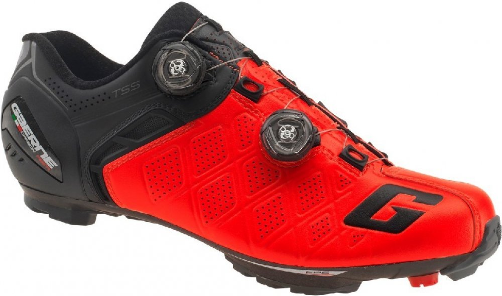 3801-005 Tretry G.Sincro nabízejí vynikající komfort a zároveň nízkou hmotnost. Horní část boty je vyrobena z mikrovlákna s laserovým perforováním, aby poskytovala vynikající prodyšnost a perfektní klima pro jezdcovu nohu. Inovativní DUAL FCS Fitting Closure Systém se skládá ze dvou koleček BOA IP-1, které nabízejí mikropolohy v obou směrech (lze utahovat i povolovat po mikropolohách) a při vytažení kolečka BOA lze botu okamžitě celou povolit. Kolečka BOA jsou po obvodu pogumovaná pro snadnější manipulaci. Boty byly navrženy technologií TSS "Tarsal Support System", který zajišťuje dokonalou polohu chodidla v botě a zároveň pomáhá co největší efektivitě při šlapání a to i v mrtvém bodě. HEEL CUP: Zcela nové přepracování zadní části tretry, kdy je pata vyrobená tak, aby nemohlo dojít k zánětu šlach a zároveň je uvnitř boty protiskluzová úprava, aby se tretry nevyzouvali. Reflexní prvky v zadní části tretry - pro maximální viditelnost i ve zhoršených světelných podmínkách. Podešev GAERNE MTB CARBON SOLE TECHNOLOGY: Testováno na nohou nejlepších profesionálních sportovců, tato nová Gaerne podešev představuje nejvyšší úspěch v podobě technologií, inovací a funkcí. Carbonové provedení nabízí tuhost a zároveň lehkost s gumovými segmenty, které jsou vysoce odolné proti oděru a opotřebení. Profil gumových segmentů poskytuje výbornou trakci, ale zároveň se nezanáší bahnem. V přední části jsou dva závitové otvory,pro namontovatování kovových čepů v případě velmi bahnitému terénu.