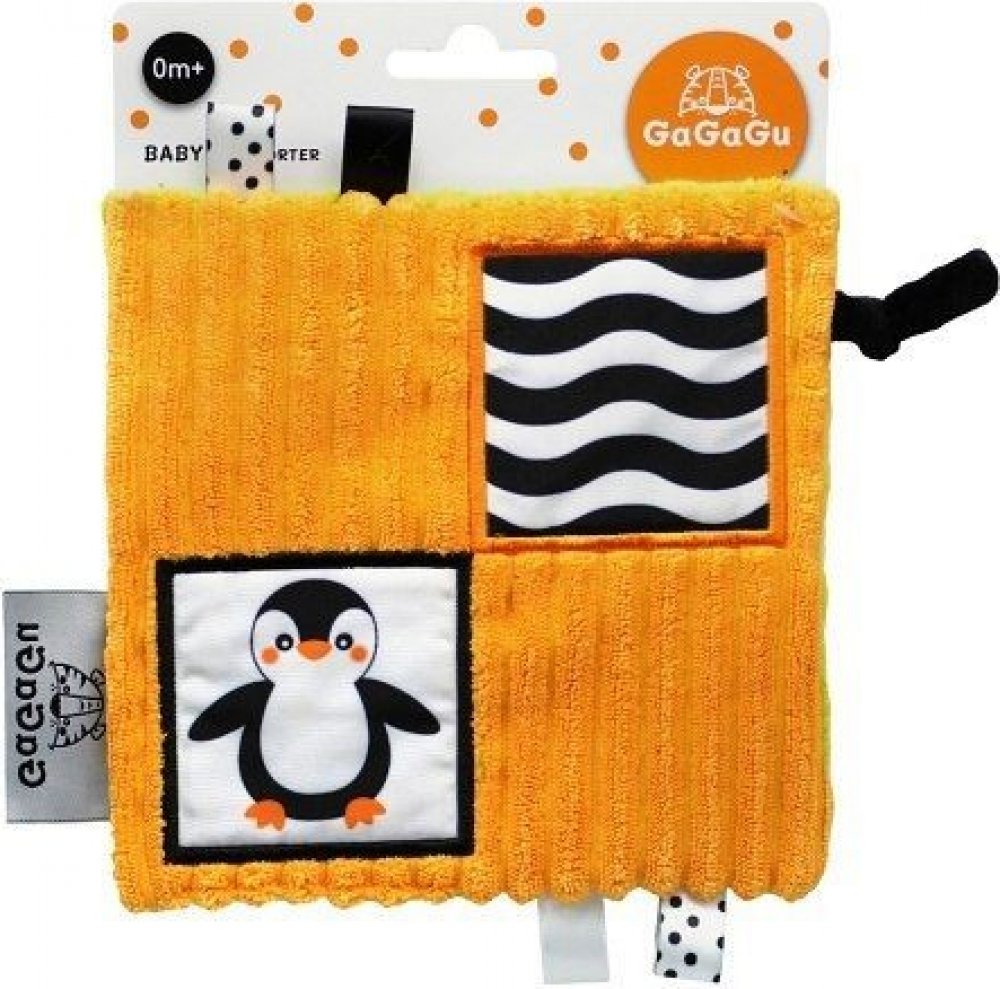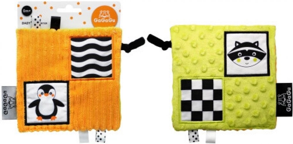Dečka má kontrastní barvy a vzory, což stimuluje zrak dítěte a šustivý materiál uvnitř hračky stimuluje jeho sluch. Dítě má možnost poznávat různé textury, díky kterým si rozvíjí hmat. Doplňkové stuhy, plyšová poutka, velký štítek - usnadňují dítěti uchopení hračky a podporují tzv. cvičení jemné motorické dovednosti (pohyby prstů a rukou). Dečka je oboustranná - na každé straně má jinou grafiku: na jedné straně tučňák - na druhé mýval. Hračka je velmi lehká a šikovná, snadno skladná, ideální na procházku nebo výlet. Je určena pro děti ve věku 0m + a je jedním z 12 produktů dostupných pod značkou GaGaGu. Kromě dečky jsou to i chrastítka, spirála, přívěsky, knížky, smyslové kostky a smyslová podložka.Informace o prodktu (v bodech):• kontrastní barvy a vzory – stimulují zrak dítěte• různé textury materiálu – stimulace hmatu• šustivý materiál – rozvoj sluchu