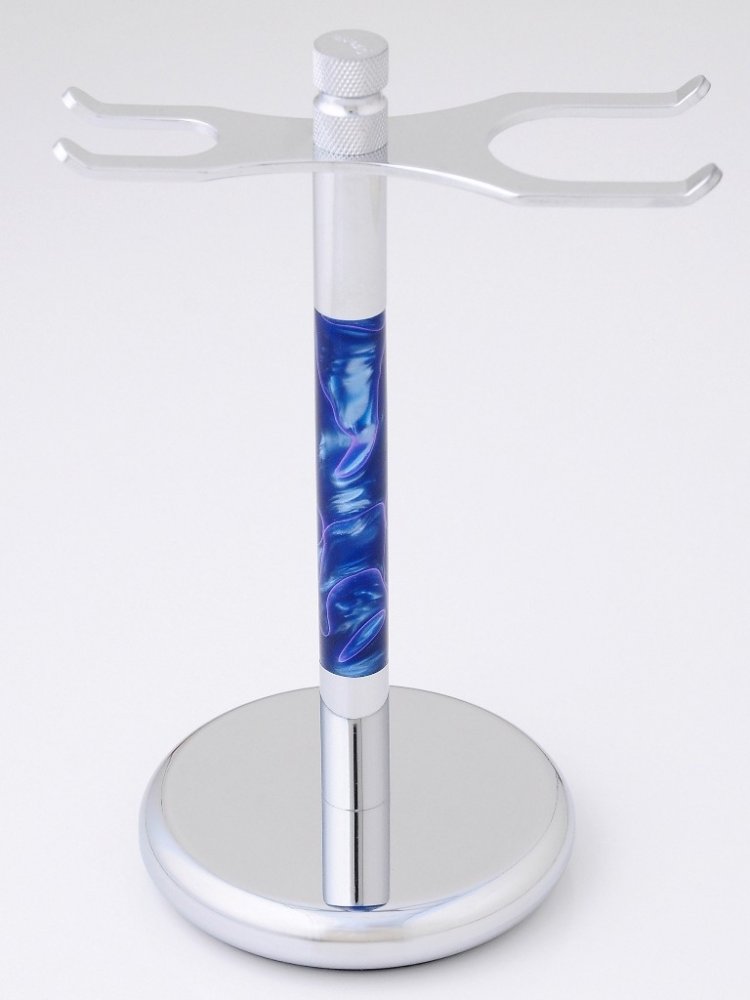 Kvalitní kovový stojánek na štětku na holení a holicí strojek. Štětka na holení by měla po použití vysychat štětinami dolů. Tím zabraníme hromadění vody v rukojeti, což může způsobit deformaci štětin.
