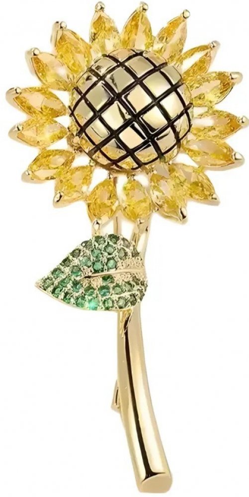 Pozlacená brož ve tvaru slunečnice, ozdobená krystaly. Krásně doplní a oživí vaše šaty nebo sako, ale i šálu nebo čepici. Brož se zapíná sponou ze zadní strany.
