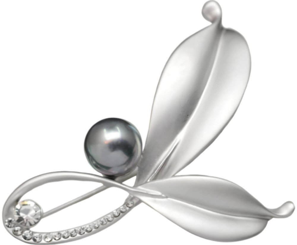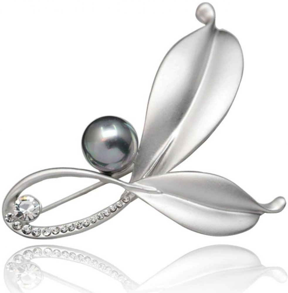 Krásná brož ve tvaru lístků s perlou, ozdobená krystaly. Krásně doplní a oživí vaše šaty nebo sako, ale i šálu nebo čepici. Brož se zapíná sponou ze zadní strany.