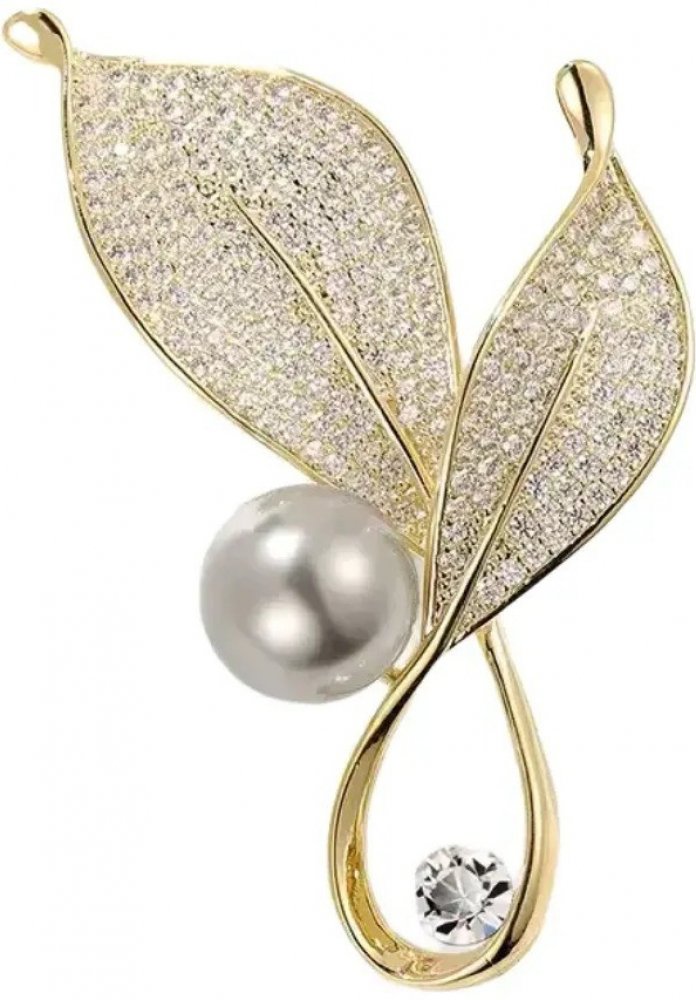 Pozlacená brož ve tvaru lístků s perlou a zirkony. Krásně doplní a oživí vaše šaty nebo sako, ale i šálu nebo čepici. Brož se zapíná sponou ze zadní strany.