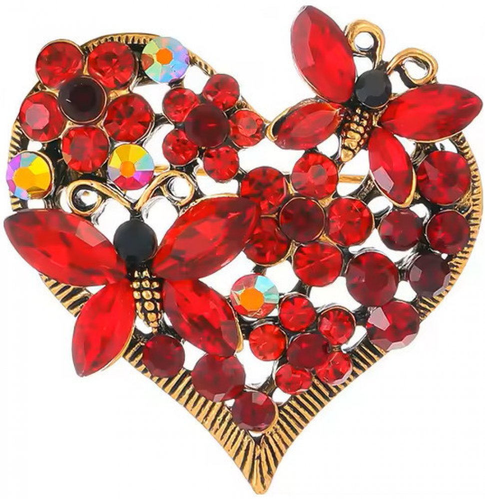 Brož ve tvaru srdce s motýlky a květy, ozdobená krystaly. Krásně doplní a oživí vaše šaty nebo sako, ale i šálu nebo čepici. Brož se zapíná sponou ze zadní strany.