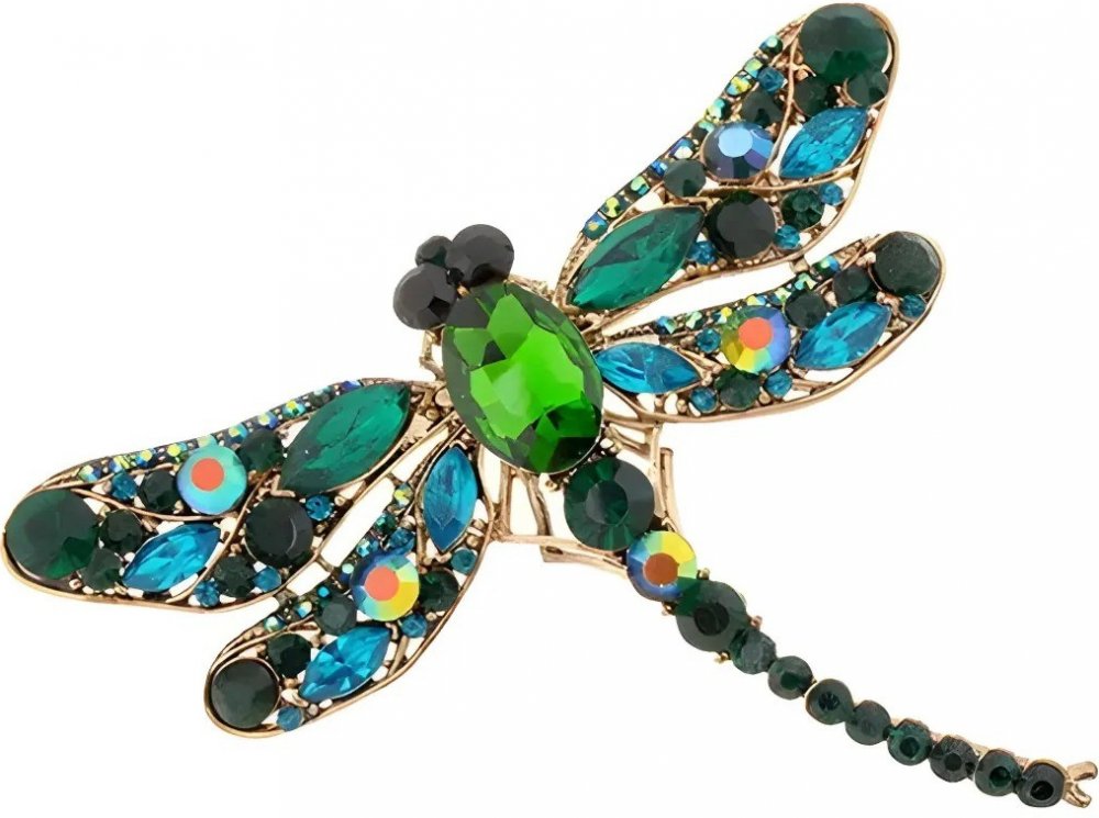 Trendy brož ve tvaru vážky, ozdobená krystaly. Krásně doplní a oživí vaše šaty nebo sako, ale i šálu nebo čepici. Brož se zapíná sponou ze zadní strany.
