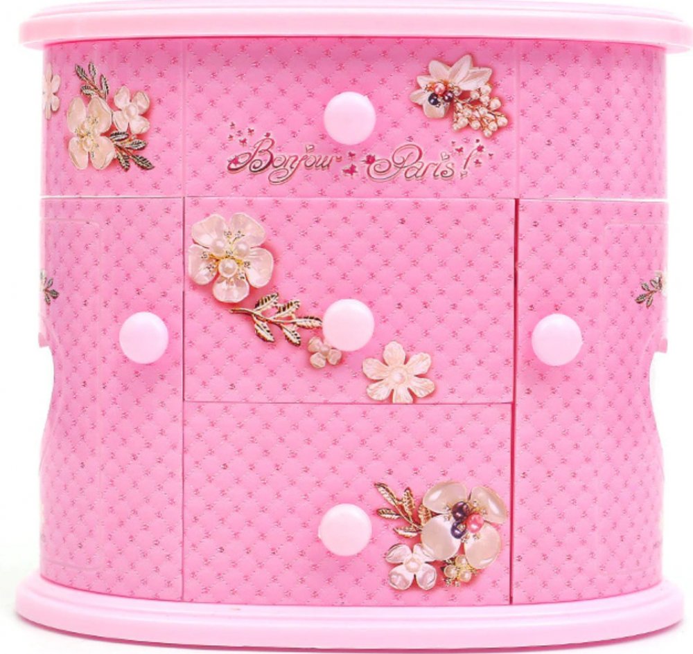 Třípatrová šperkovnice v růžové barvě se zrcátkem ve víku. Pod víkem jsou sloty na prstýnky. V přední straně jsou 2 šuplíčky a pod bočními dvířky se srdíčky jsou háčky na řetízky. Při otevření víka začne tančit bailarína a šperkovnice přehrává melodii.