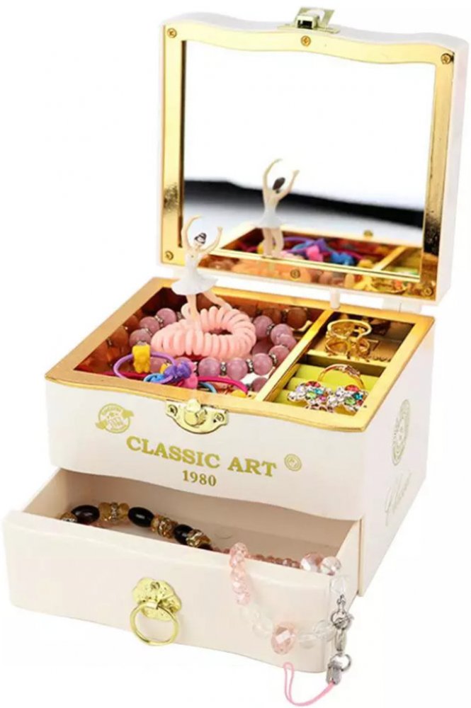 Dvoupatrová hrací šperkovnice s baletkou. Při otevření víka začne hrát melodie. Na víku je z venkovní strany srdíčko a z vnitřní strany praktické zrcátko. Hrací mechanismus se natahuje klíčkem ze zadní strany šperkovnice.