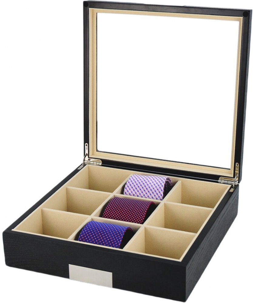 Dřevěná kazeta s proskleným víkem na 9 ks pánských kravat. Kazeta je v černém provedení. Kravaty na obrázku nejsou součástí kazety.