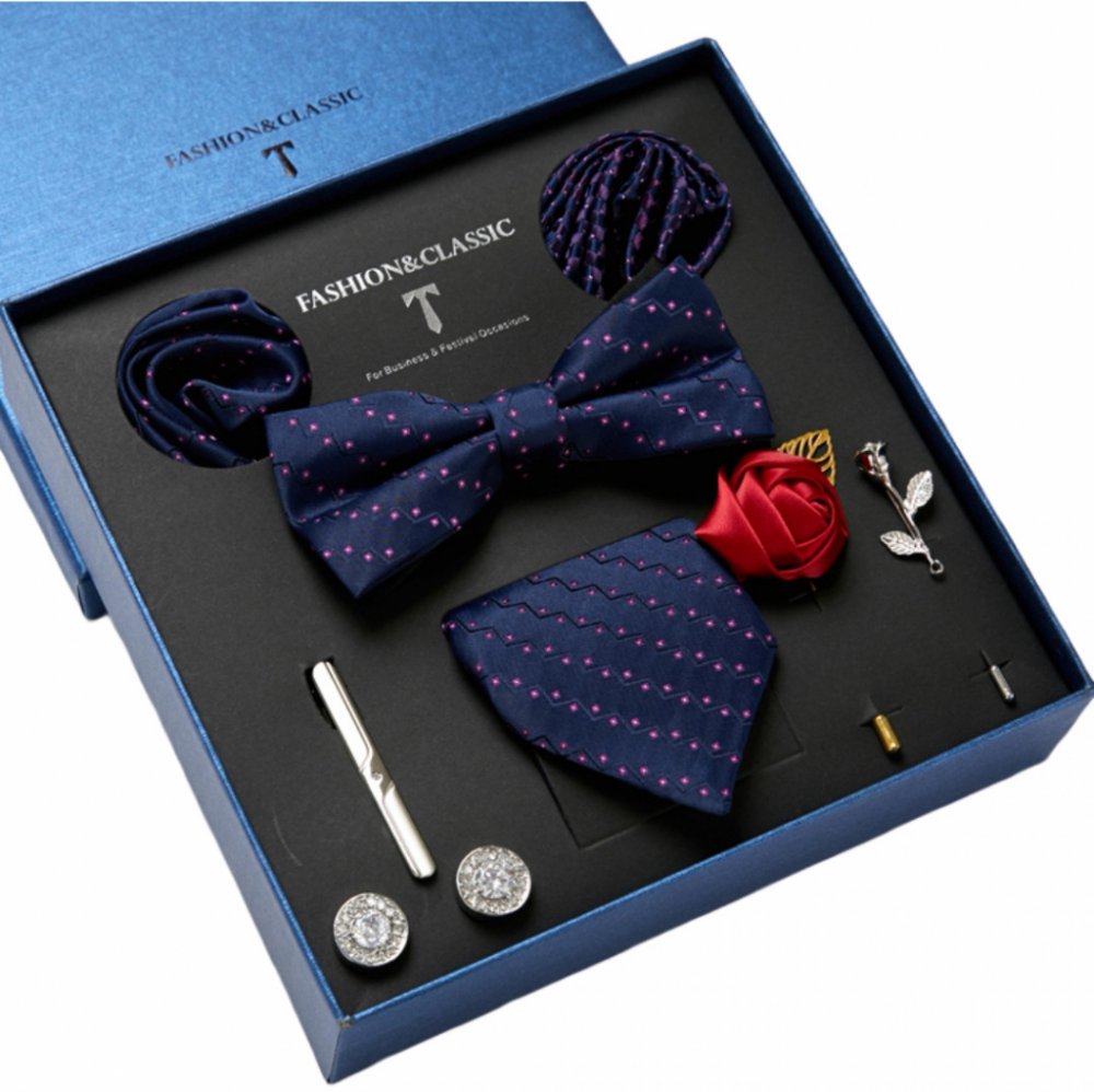 Pánská dárková souprava obsahuje kravatu, motýlek, 2 kapesníčky, manžetové knoflíčky a 2 brože do klopy. Vše ve stejném barevném i materiálovém provedení. Kravata je velmi příjemná na dotek, dělá dobrý dojem. Manžetové knoflíčky se nosí ke košilím, které mají zesílené lemy rukávů. Sada je dodávána v modré dárkové krabičce.