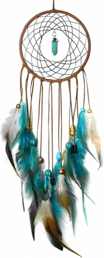 Dekorativní lapač snů s vypleteným kruhem. Lapač je ozdoben třásněmi s pravými pery v barvě tyrkysu.