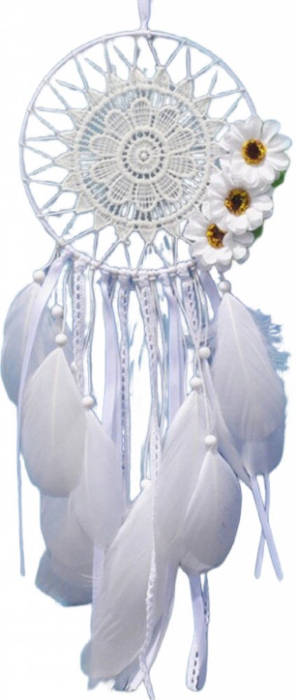 Dekorativní lapač snů s vypleteným kruhem se třemi květy. Lapač je ozdoben třásněmi s pravými pery.