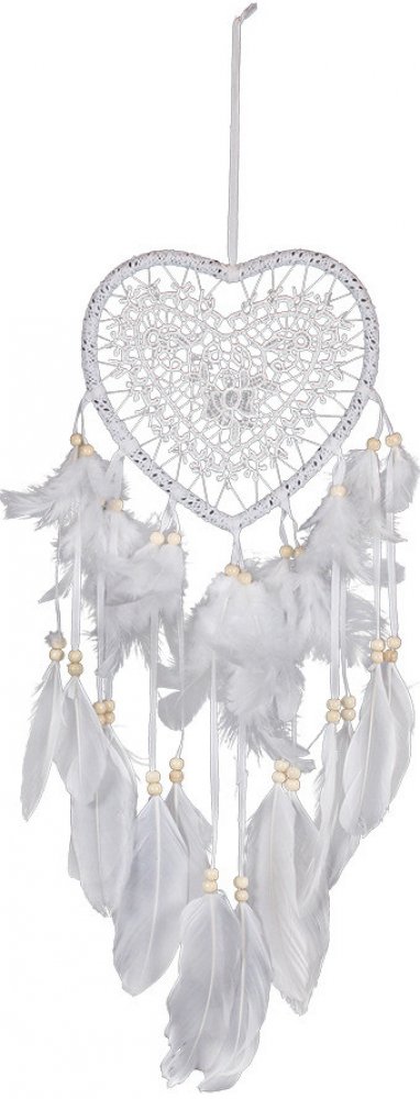 Dekorativní lapač snů s vypleteným srdcem. Lapač je ozdoben třásněmi s pravými pery.