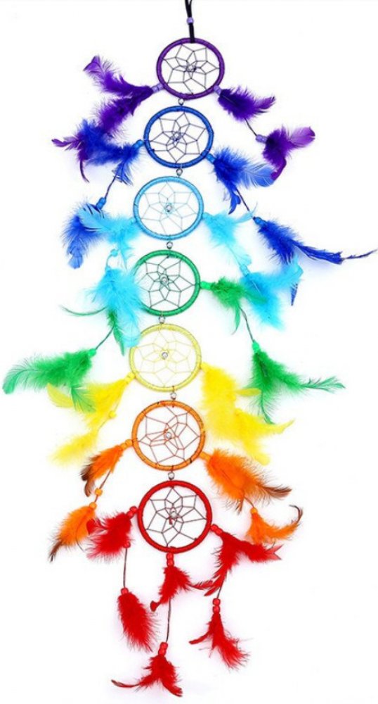 Dekorativní lapač snů v barvách čaker. Lapač je ozdoben pravými pery a sedmi vypletenými kruhy. Jednotlivé kruhy jsou ozdobeny pery ve stejné barvě.