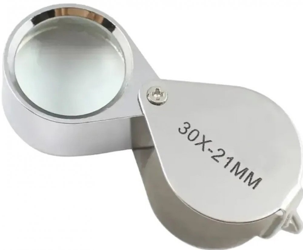 Kapesní skládací lupa s 30-ti násobným zvětšením v plastové krabičce. Lupa je vhodná například na prohlížení šperků nebo elektroniky ale i pro sběratele meteoritů a minerálů. Díky kovovému očku na krytu ji můžete připnout na klíče nebo pomocí šňůrky nasadit na krk. Rozložená lupa má rozměry 60x25x18 mm, složená 42x25x18 mm. Průměr lupy je 21 mm.