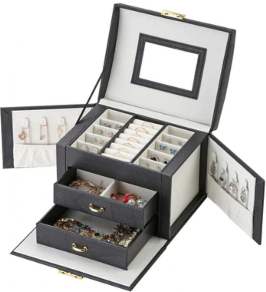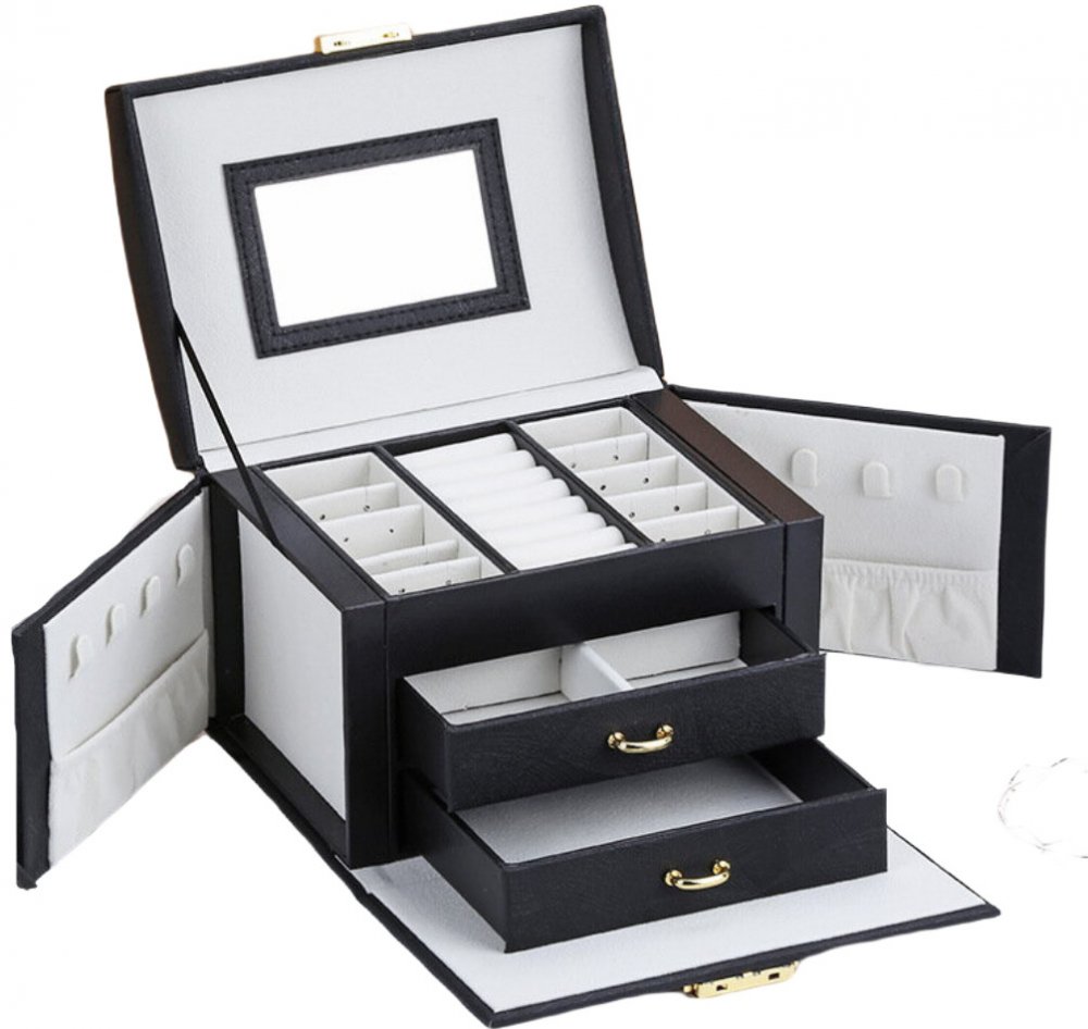 Třípatrová šperkovnice v černé barvě s uzamykatelným víkem. Ve víku je praktické zrcátko. V otevíracích bocích jsou háčky na řetízky a kapsičky na šperky. Na horní části víka je madlo pro snadné přenášení.