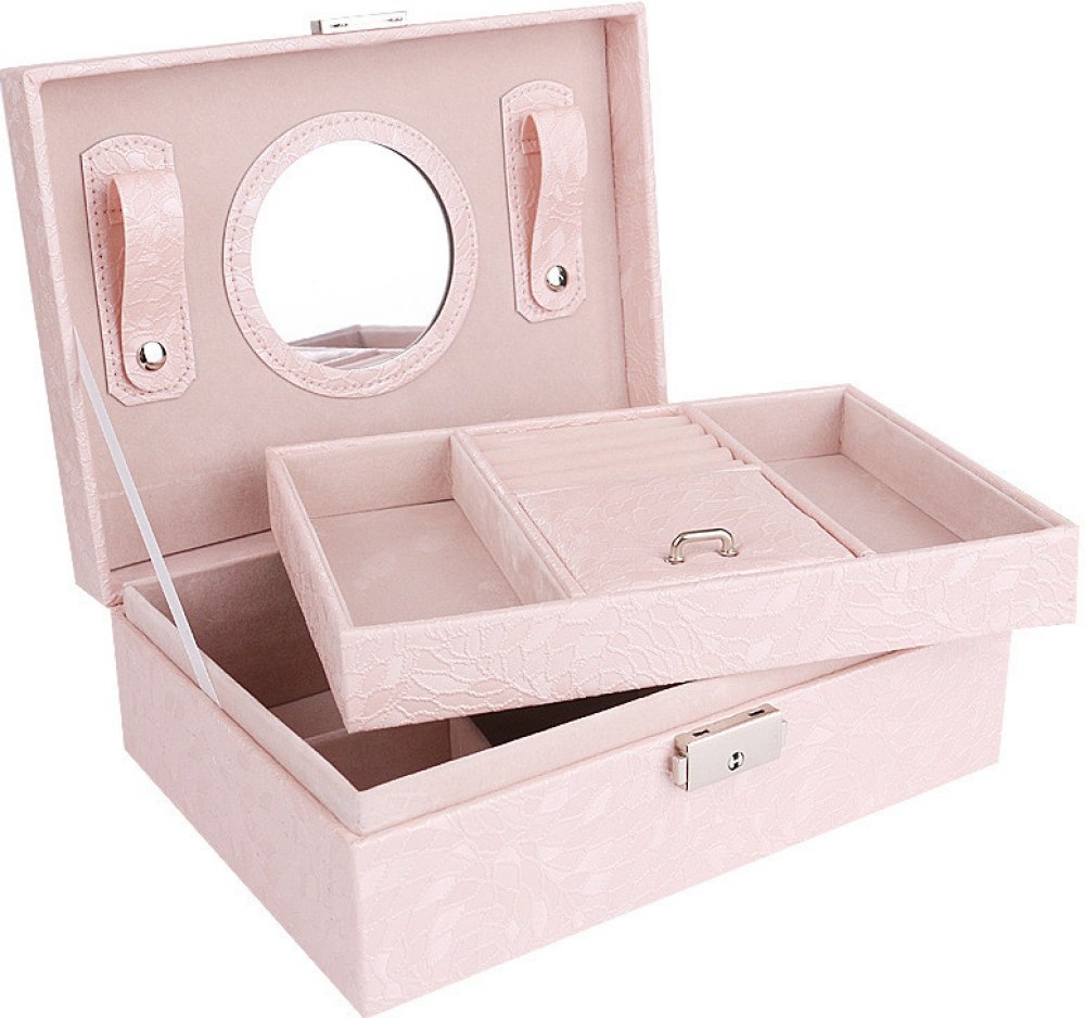 Dvoupatrová šperkovnice ve tvaru kazety se stříbrným kováním. Povrch šperkovnice má reliéf s květinami. Ve víku šperkovnice je praktické kruhové zrcátko a dva úchyty na řetízky. Šperkovnici je možné uzamknout kvalitním pružinovým zámkem.