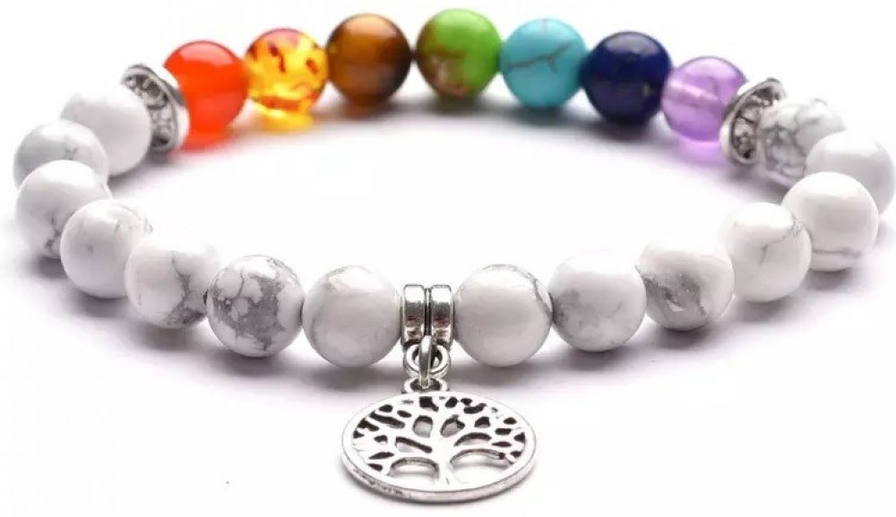 Náramek z bílých kamenů ozdobený sedmi kameny v barvách čaker na flexibilním kroužku. Ozdobte své zápěstí nadčasovým doplňkem v kombinaci kamenů a přívěsku Strom života.