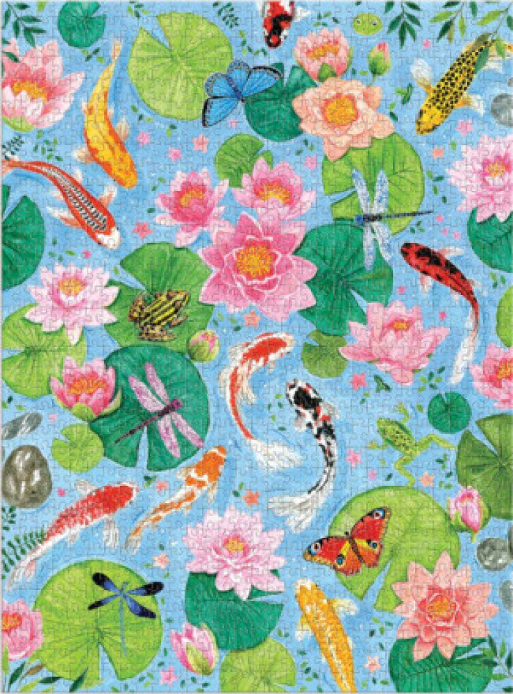 Puzzle zobrazuje nádherně ilustrované rostliny a ryby Koi v rybníčku pro uklidňující a radostný zážitek ze skládání puzzle.