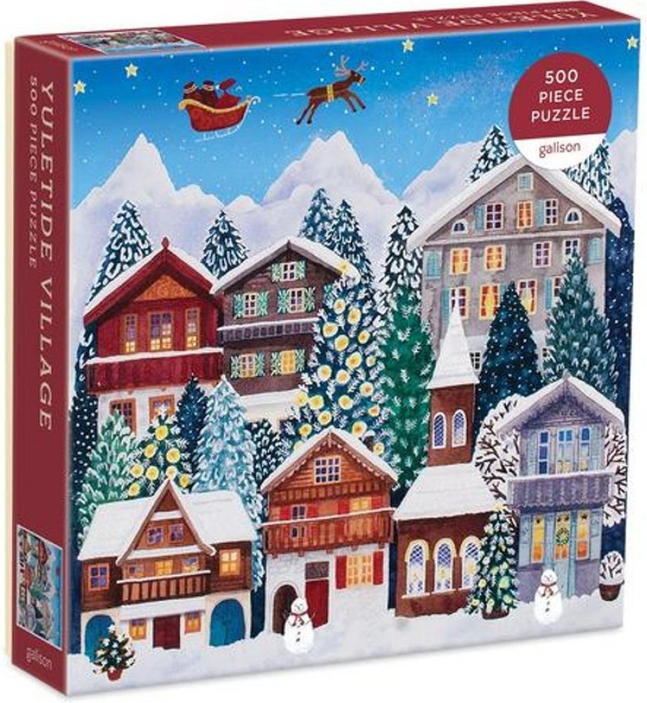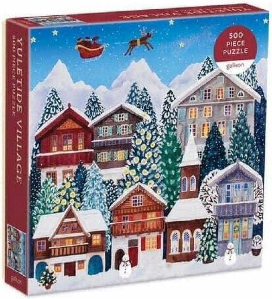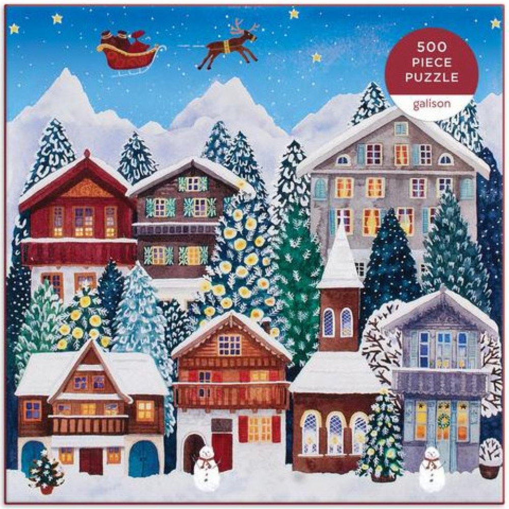 Vánoční puzzle s 500 dílky obsahuje okouzlující ilustrace sváteční vesnice během svtečních dnu, včetně sněhuláků, ozdobených stromků a Santy letícího nad nimi. Puzzle je baleno v pevných krabicích s matným povrchem.