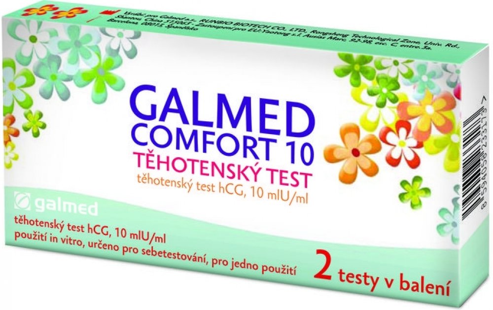 Galmed těhotenské reakční proužky z moči do 5 minut 99 % imunoenzymatická reakce hCG ≥ 10 mIU/ml Hubei Meibao pro ženy 2 ks hCG 2–30 °C, nezmrazovat domácí sebetestování