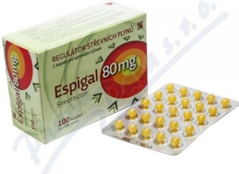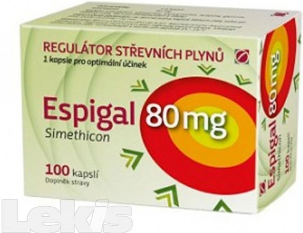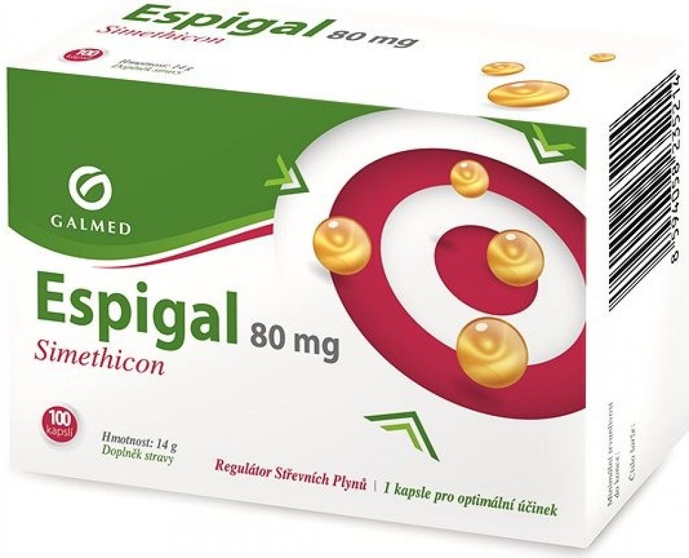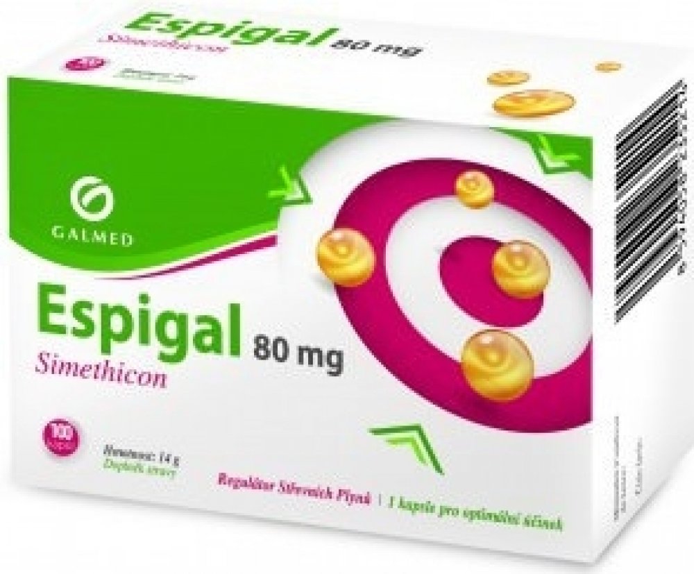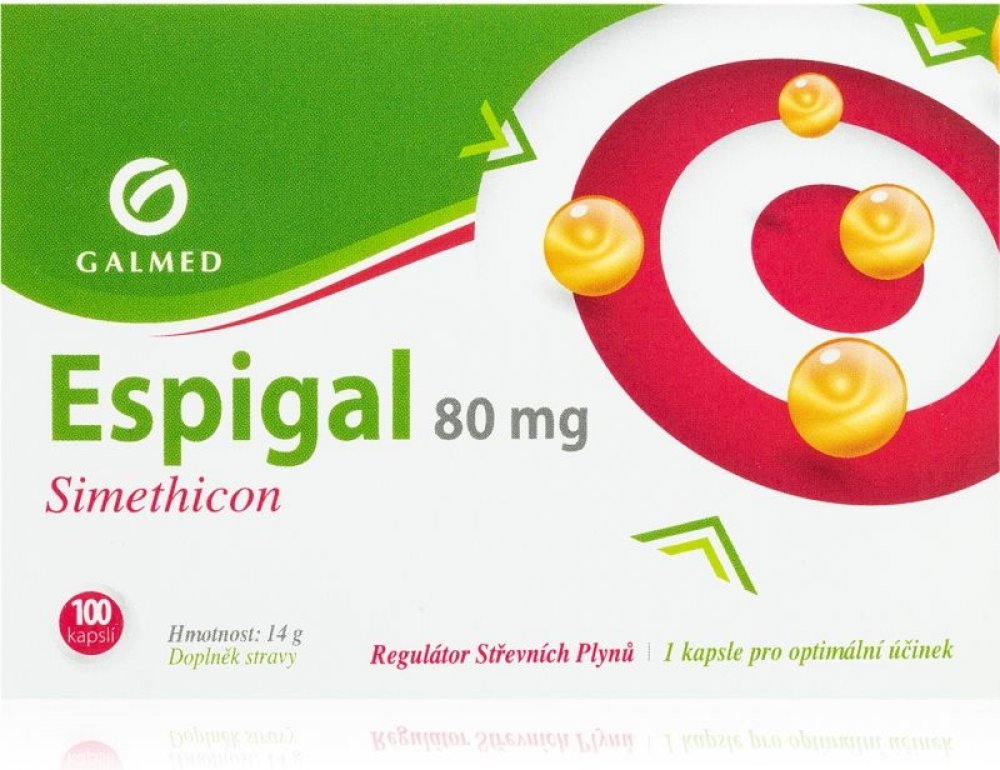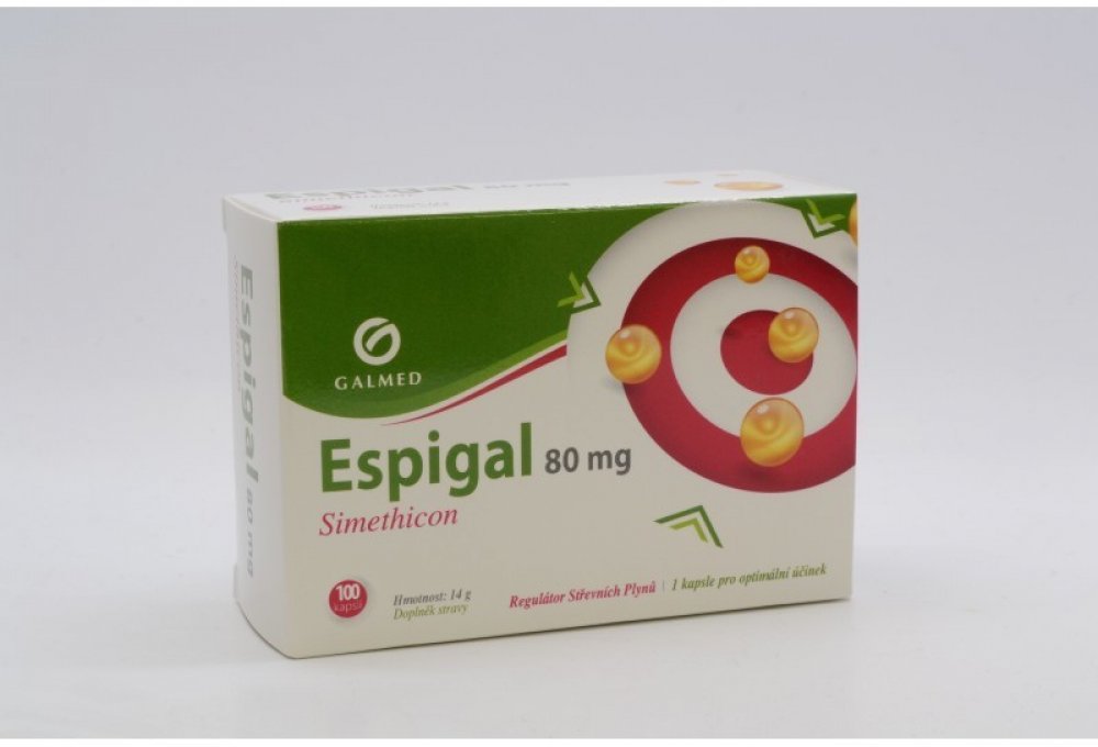 Účinně reguluje tvorbu střevních plynů Espigal je speciální přípravek, který účinně reguluje tvorbu střevních plynů. Je proto vhodný při nadýmání, pocitu tlaku a plnosti v podbříšku, zvýšeném odchodu střevních plynů apod.