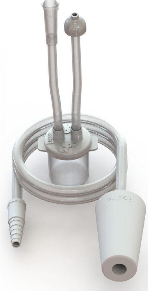 Transparentní nádobka s víčkem (10 ml), hadička PVC 4,0/6,0 mm s ústní koncovkou, hadička PVC 4,0/6,0 mm s nosní koncovkou, spojovací kužel a hadička 900 mm s nástavcem na vysavač.