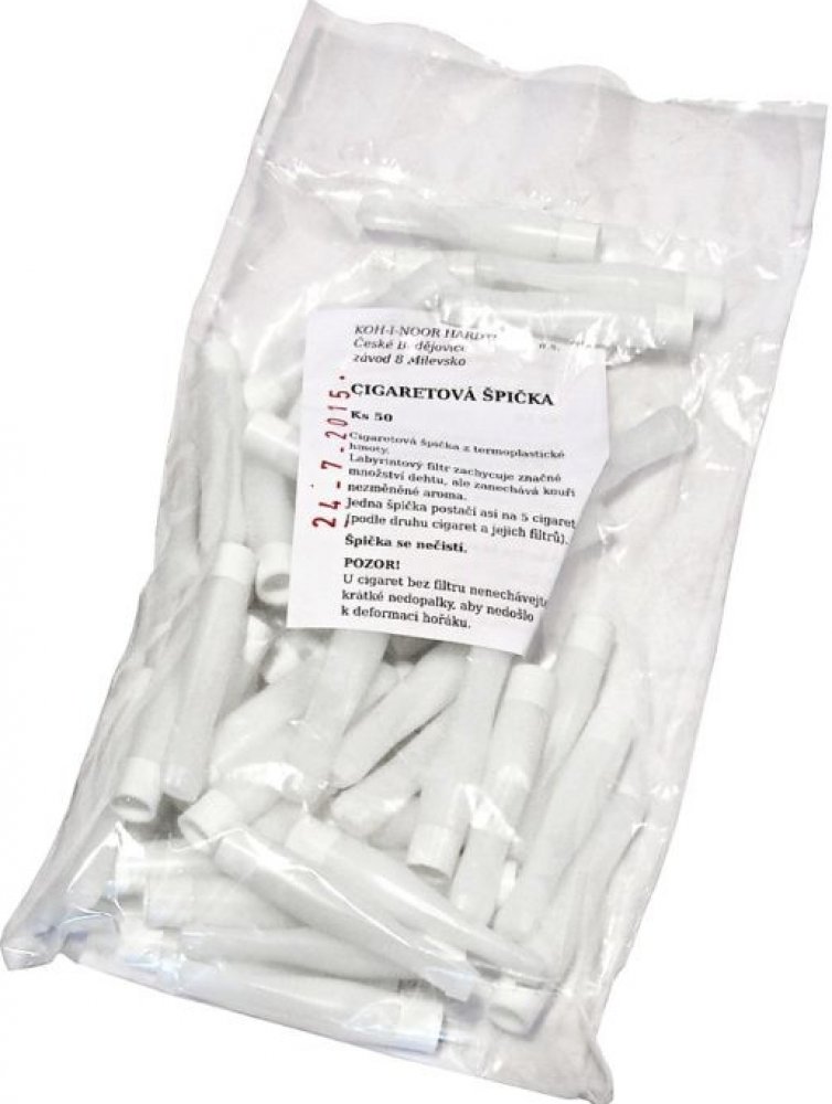 30086 / 220010006Cigaretová špička z termoplastické hmoty.Labyrintový filtr zachycuje značné množství dehtu, ale zanechává kouři nezměněné arroma.Jedna špička postačí asi na 5 cigaret (podle druhu cigaret a jejich filtrů)ŠPIČKA SE NEČISTÍ. Délka 5,5cm, průměr 0,8cm.