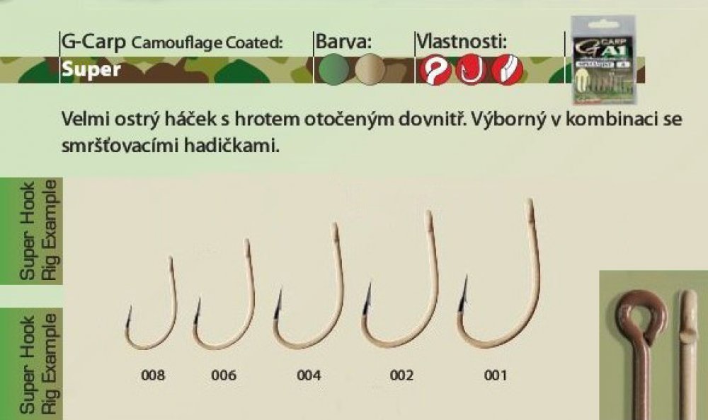 Maskování nástrah na kapry tvoří velmi důležitý předpoklad úspěchů moderního kapraře. Gamakatsu představuje speciální potah háčků a dostává maskování na ještě vyšší úroveň! Po intenzivním vývoji a testech byl vytvořen potah, který nejen dobře vypadá, ale i přebírá výborné vlastnosti háčků G-Carp A1. Dvoutónový potah je dostupný ve dvou verzích, které byly speciálně adaptovány na evropský styl kaprařiny. První kombinace, "temný les" s "jablečnou zelení", může být perfektně použita na travnatých plochách a listech leknínu. Druhá barevná kombinace je navržena pro maximální maskování na písečném a bahnitém dně, nádech kávové hnědi a písečné žluti jí pod vodou činí téměř neviditelnou.