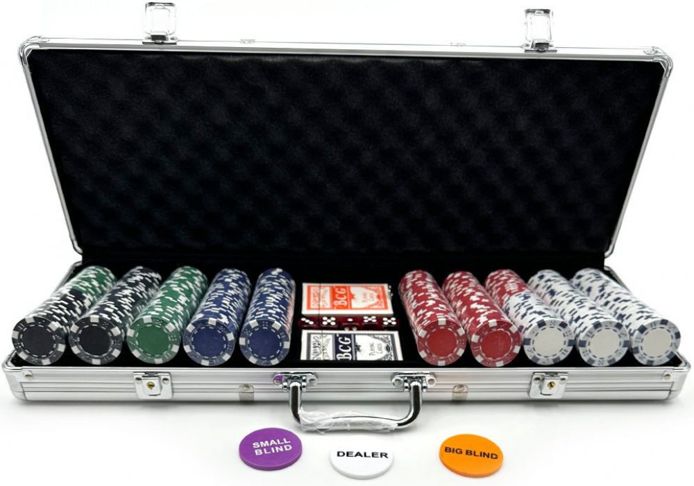 Kompletní sada potřebná k zorganizování pokerového turnaje. Pokerová sada v hliníkovém kufříku vždy připravená a snadno přenosná. Stačí jen rozložit a může začít skutečná pokerová partie pro 6-8 hráčů. Kvalitní klasický pokerový set v hliníkovém kufříku. 500 kusů neočíslovaných žetonů o hmotnosti 11,5 gramů. Set obsahuje vše, co budete pro pokerový turnaj pro 6-8 hráčů potřebovat. Balení obsahuje: Uzamykací hliníkový kufřík se zaoblenými rohy a 2 ks klíčů Žeton Dealer, Big Blind a Small Blind 2 balíčky papírových karet 5 kusů pokrových kostek Žetony: modré: 100 ks černé: 75 ks zelené: 75 ks červené: 125 ks bílé: 125 ks Průměr žetonů: 40 mm Tloušťka žetonů: 3,3 mm Hmotnost žetonů: 11,5 g/ks (s kovovým jádrem) Vnější rozměry kufříku: 56 x 21 x 7 cm Hmotnost celé sady: cca 6,9 kg