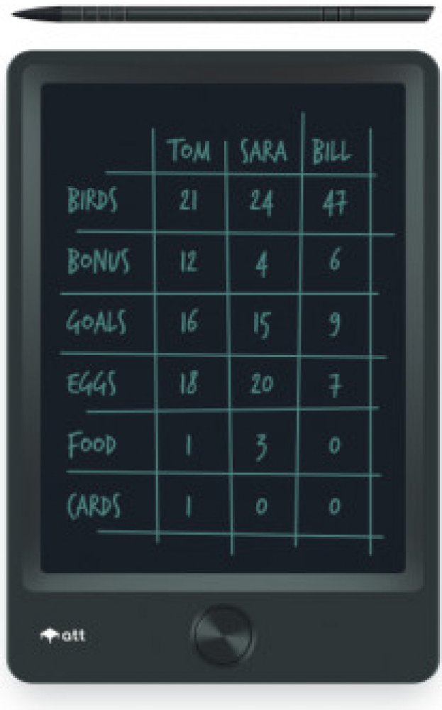 Elektronický zápisník vhodný nejen pro zapisování výsledků her. Přístroj má displej 8,5 palce, funkci uložení obrazovky, funkci mazání, a navíc je šetrný k očím a životnímu prostředí. Obsahuje také stylus, neboli speciální tužku.