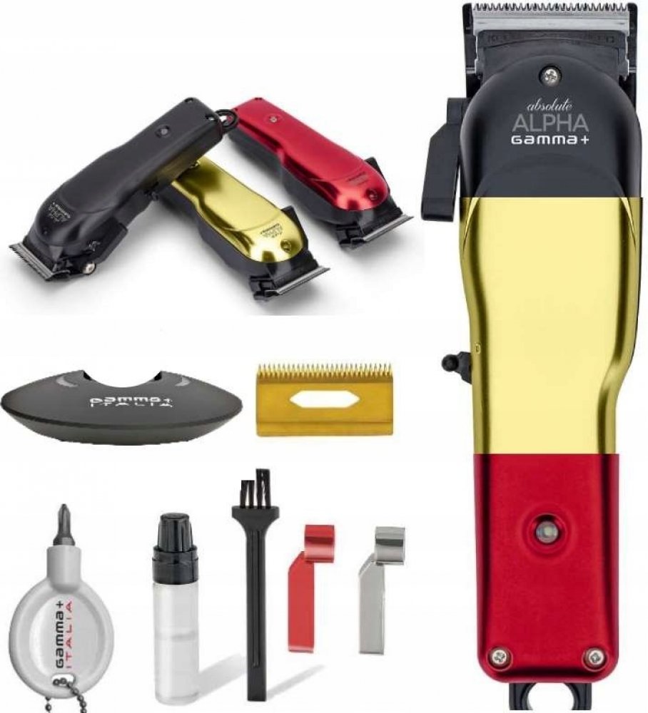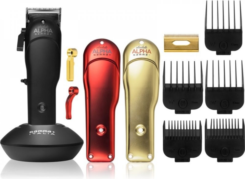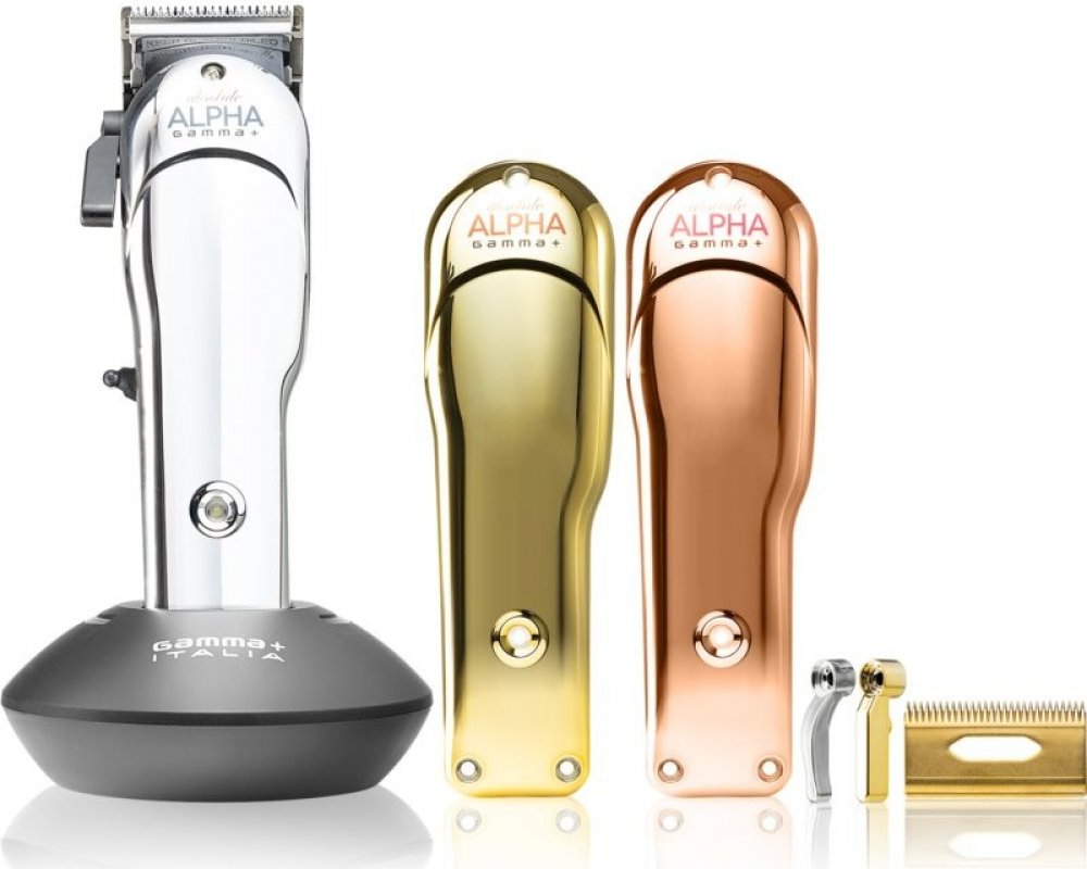 GAMMA PIU - Absolute Alpha Gamma+ Professional Modular Clipper Cordless Špičková italská kvalita, styl i výkon. Absolute Alpha strojek je vybaven silným rotačním motorem, který je výkonný, tichý a lehký. První strojek, který obsahuje vyměnitelné kryty (chromovaný, zlatý a růžové zlato), kryty jsou součástí balení. Lithium-iontová baterie s výdrží 240 minut nepřetržitého provozu se díky USB nabíječce nabije do plna už za 2 hodiny. Dodáváno s nabíjecím stojánkem. Vlastnosti: 45mm široká čepel Black Gamma+ Fusion Nastavení výšky nože od 0,8 mm do 3,3 mm páčkou přímo na strojku Sada 5 magnetických hřebenů od 1.5 mm do 13 mm náhradní zlatý střihací nůž Sada pro čištění a údržbu Vyměnitelné kryty součástí balení