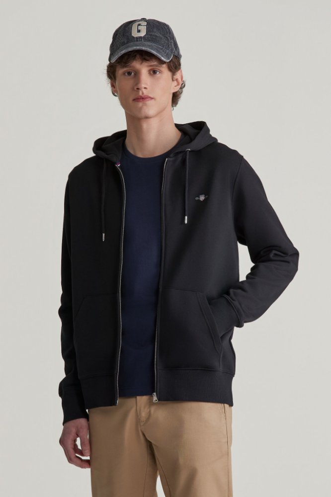 Celopropínací pánská mikina na zip s kapucí a ikonickým logem značky Gant vyšitým na hrudi. Rovný, perfektně padnoucí střih zakončený žebrovanými náplety v pase i kolem zápěstí doplňují dvě praktické boční kapsy. Materiálové složení kvalitního žerzeje je tvořeno vysokým podílem příjemně měkkého a dokonale prodyšného bavlněného vlákna, které je zárukou vysoce komfortního pocitu v průběhu nošení. Praktický artikl, který se stane velmi oblíbenou součástí Vašich sportovních, volnočasových outfitů.