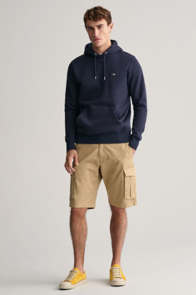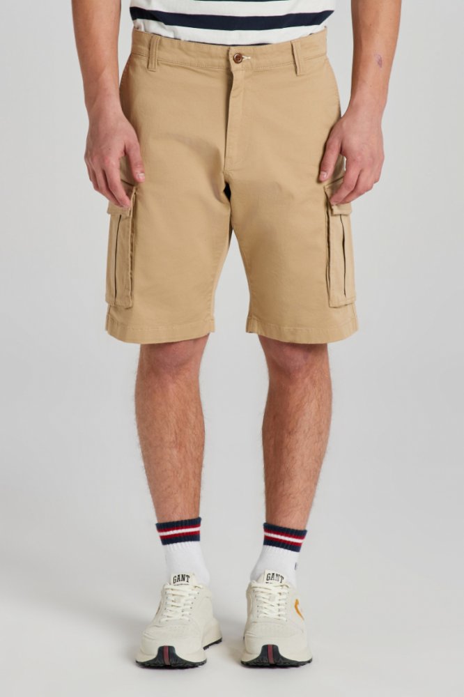 Pánské plátěné šortky s nakládanými kapsami na stehnech. Rovný střih nohavic s délkou ke kolenům, standardní výška pasu. Klasické kalhotové zapínání, poutka na opasek, dvě šikmé boční a dvě zadní výpustkové kapsy s patkou. Minimalistický branding. Materiálové složení je tvořeno příjemně měkkou tkaninou v odolné twillové vazbě z bavlněného vlákna prémiové kvality, které představuje záruku prodyšnosti a vysoce komfortního pocitu v průběhu nošení. Praktický artikl, který se stane velmi oblíbenou součástí Vašich volnočasových outfitů.