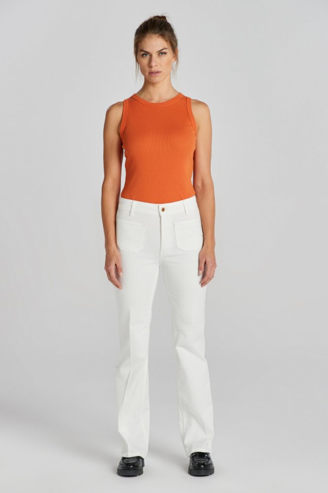 Dámské denimové kalhoty bootcut střihu s úzkými nohavicemi, které se od kolen dolů rozšiřují. Jednobarevný design s vysokým pasem, předními našitými kapsičkami a poutky na opasek doplňují dvě našité kapsy s koženou záplatou umístěné na zadním díle. Odolná bavlněná tkanina s příměsí kvalitního elastanového vlákna zaručuje dokonalou pružnost, přizpůsobivost a maximální komfort v průběhu nošení. Velmi praktický kousek, který stylově doladí Váš sportovně-elegantní outfit.
