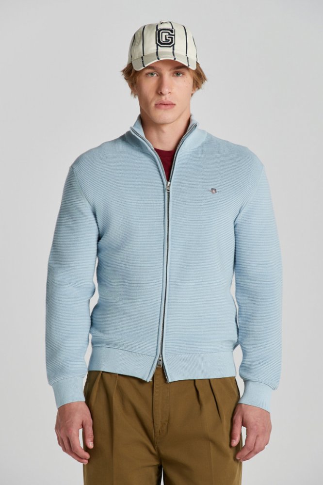 Pánský celopropínací svetr z jemně texturované, odlehčené pleteniny. Praktické zakončení rovného střihu žebrovanými náplety v pase i na rukávech, zapínání na dvojcestný zip do stojáčku. Gant logo vyšité na hrudi. Materiálové složení je tvořeno bavlněným vláknem prémiové kvality, které vyniká svou příjemnou měkkostí a dokonalou prodyšností. Vysoce komfortní, šmrncovně vypadající artikl, který se st...