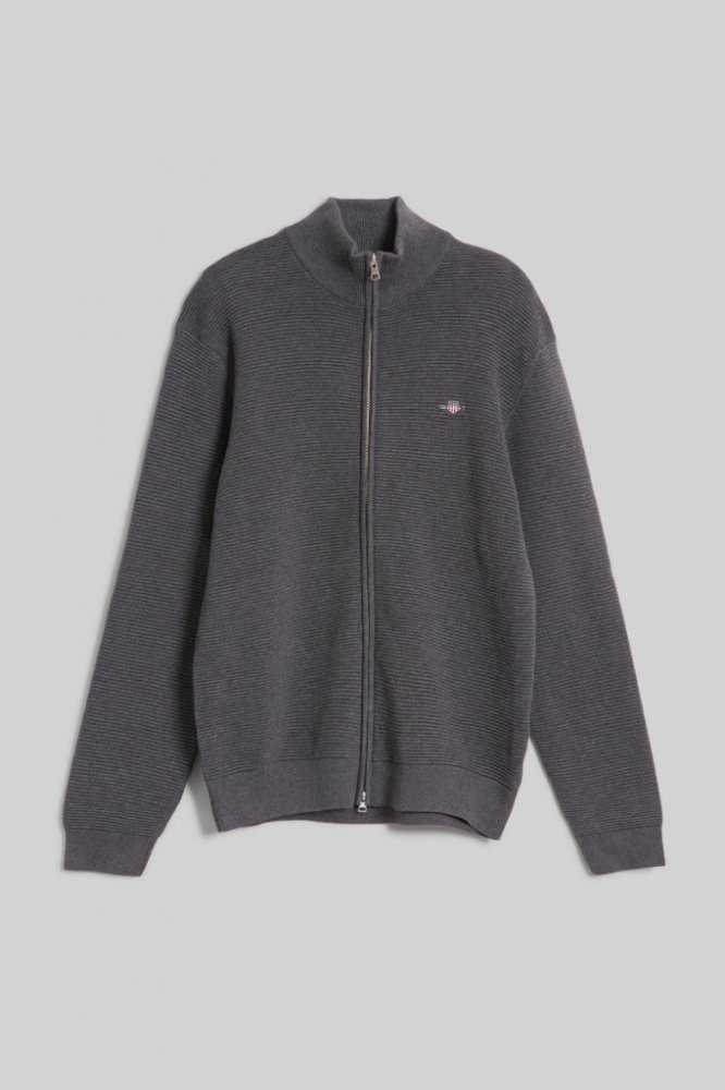 Pánský celopropínací svetr z jemně texturované, odlehčené pleteniny. Praktické zakončení rovného střihu žebrovanými náplety v pase i na rukávech, zapínání na dvojcestný zip do stojáčku. Gant logo vyšité na hrudi. Materiálové složení je tvořeno bavlněným vláknem prémiové kvality, které vyniká svou příjemnou měkkostí a dokonalou prodyšností. Vysoce komfortní, šmrncovně vypadající artikl, který se st...