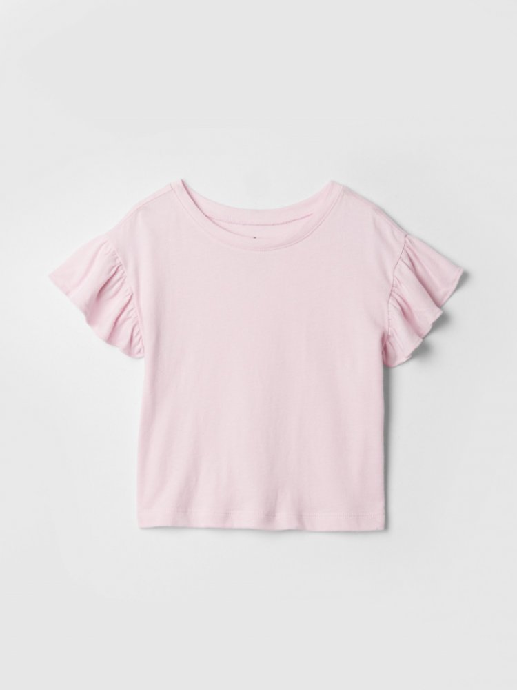 Dívčí bavlněné tričko.Se vzorem.Krátké volánkové rukávy.Kulatý výstřih.Rovný střih.