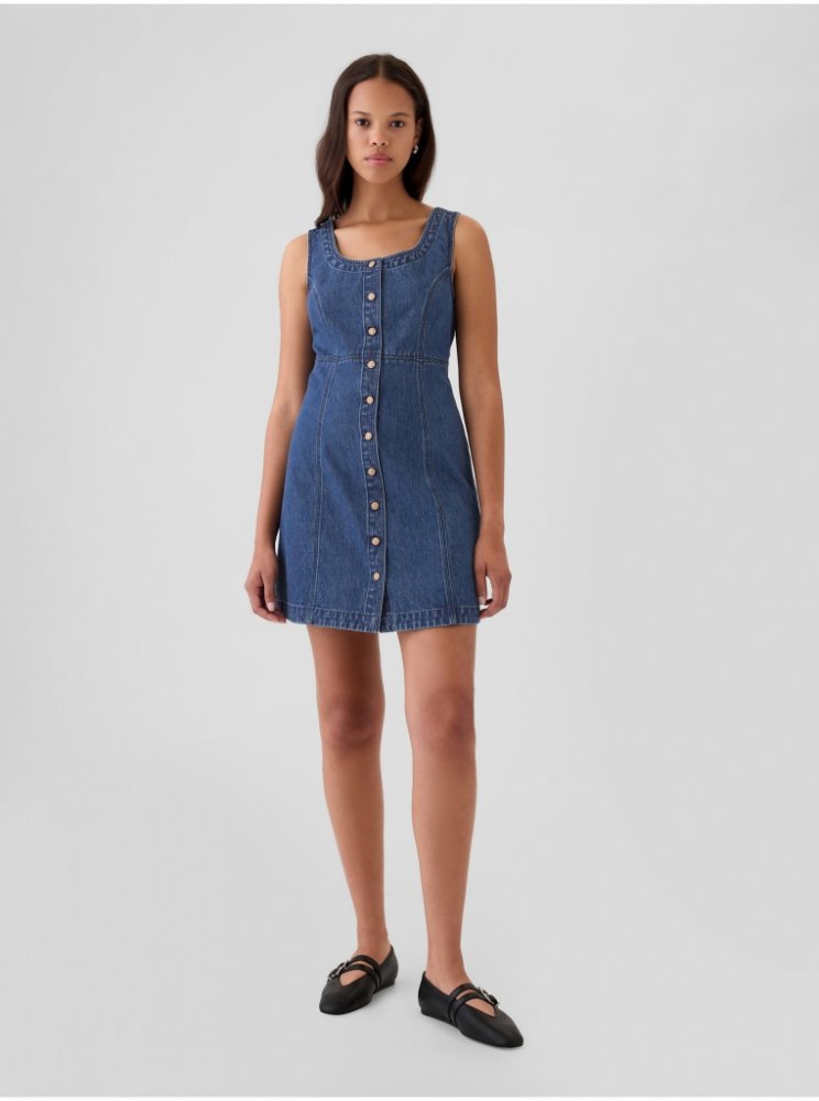 Dámské džínové šaty. Na ramínka. Zapínání na knoflíky vpředu.Úzký střih a silueta ve tvaru A. Délka nad kolena. Modelka má přibližně178 cm a nosí velikost S (4). Modelka má přibližně 178 cm a nosívelikost L (14).Materiál: 100 % bavlnaBarva: modráUdržitelnost: při výrobě bylo spotřebováno méně vody Zapínání: knoflíky