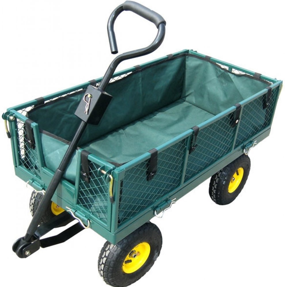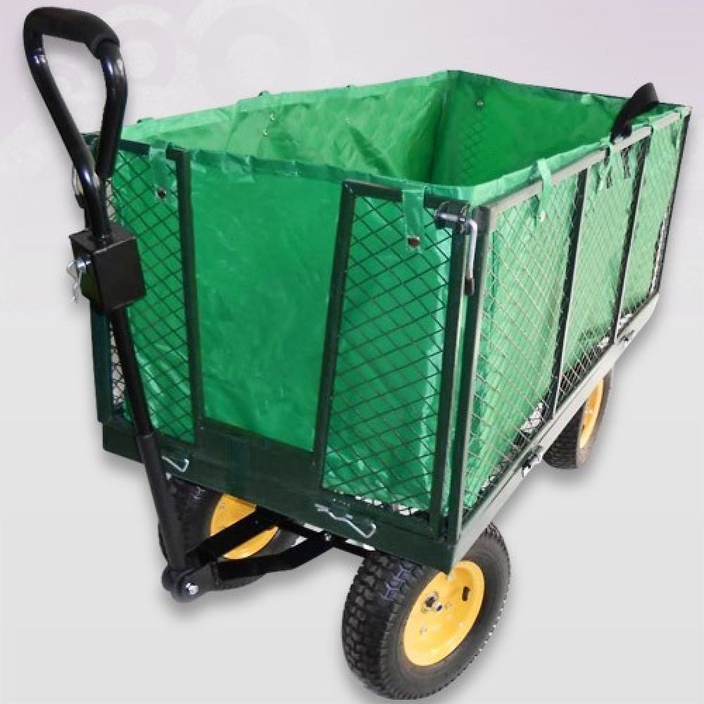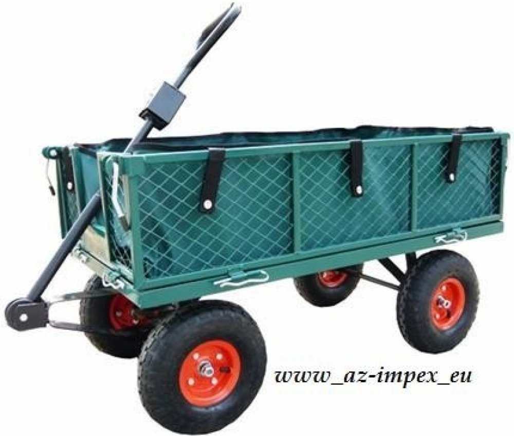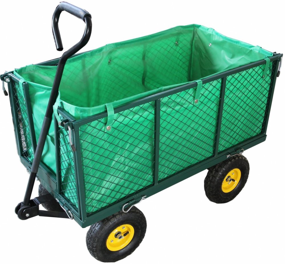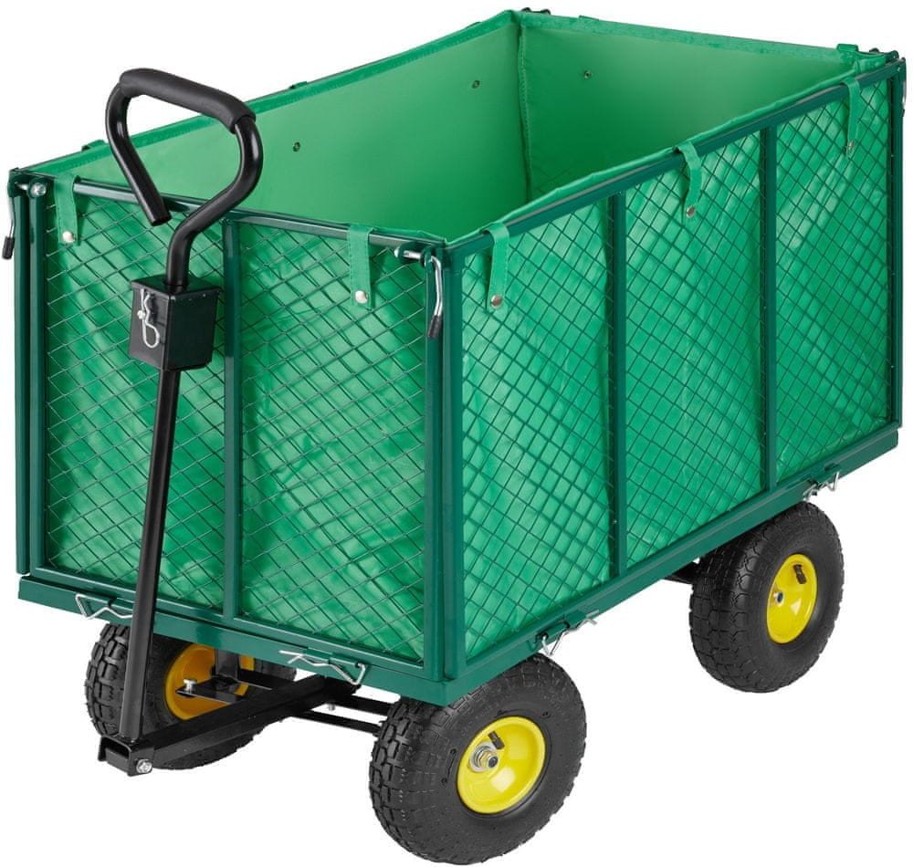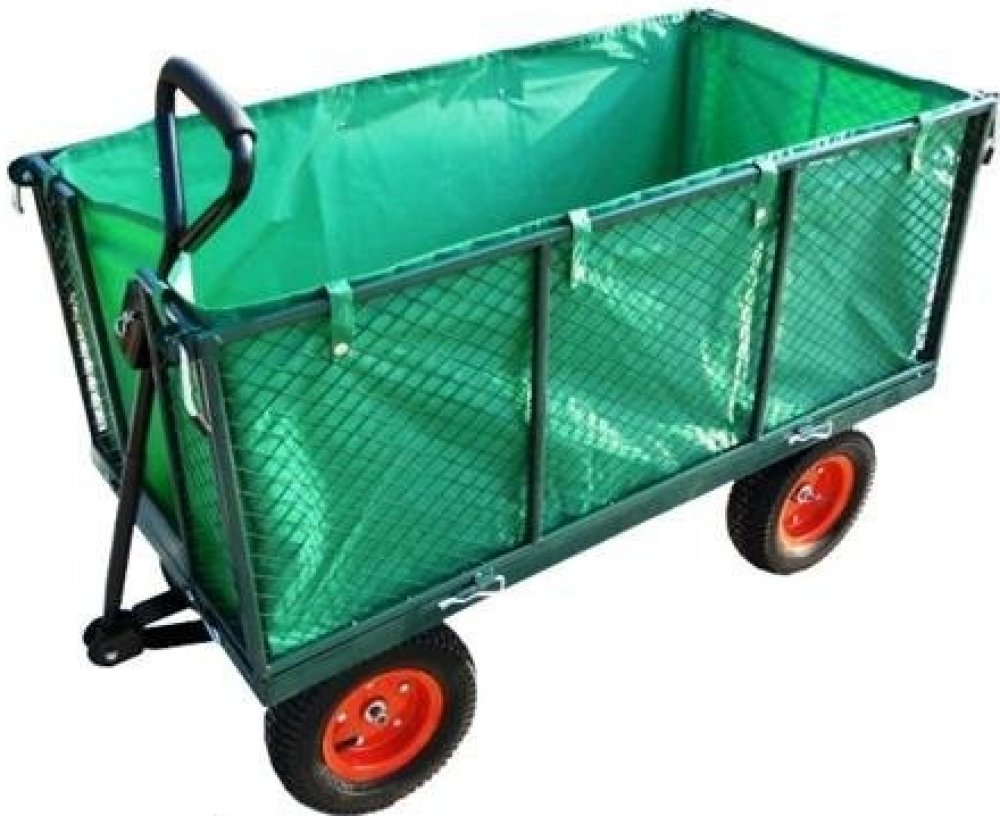 Ruční zahradní vozík s výklopnými boky a plachtou má stabilní kovovou konstrukci s pevnými pneumatikami a dvojitou nápravou. Korbička má nosnost až 550 kg. Díky stabilní rukojeti je přepravní vozík snadno ovladatelný a je vhodný pro práci jak v zahradnictví, tak i na stavbě.